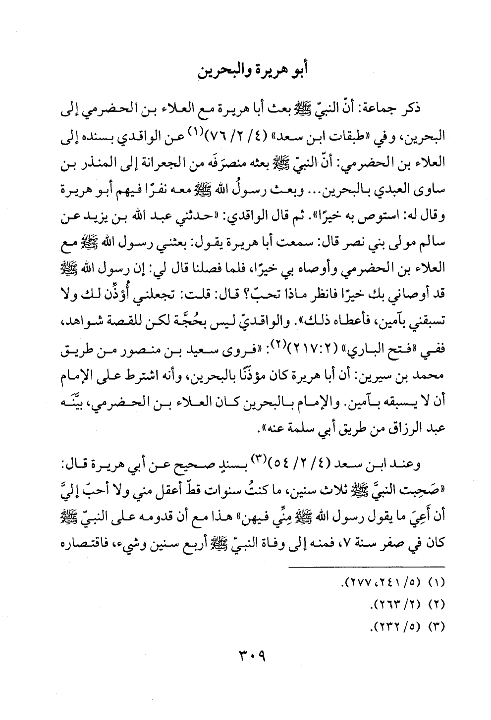 ذكر جماعة: أنّ النبيّ - صلى الله عليه وسلم - بعث أبا هريرة مع العلاء بن الحضرمي إلى البحرين، وفي «طبقات ابن سعد» (٤/ ٢/٧٦) (¬١) عن الواقدي بسنده إلى العلاء بن الحضرمي: أنّ النبيّ - صلى الله عليه وسلم - بعثه منصرَفَه من الجعرانة إلى المنذر بن ساوى العبدي بالبحرين ... وبعث رسولُ الله - صلى الله عليه وسلم - معه نفرًا فيهم أبو هريرة وقال له: استوص به خيرًا». ثم قال الواقدي: «حدثني عبد الله بن يزيد عن سالم مولى بني نصر قال: سمعت أبا هريرة يقول: بعثني رسول الله - صلى الله عليه وسلم - مع العلاء بن الحضرمي وأوصاه بي خيرًا، فلما فصلنا قال لي: إن رسول الله - صلى الله عليه وسلم - قد أوصاني بك خيرًا فانظر ماذا تحبّ؟ قال: قلت: تجعلني أُؤذِّن لك ولا تسبقني بآمين، فأعطاه ذلك». والواقديّ ليس بحُجَّة لكن للقصة شواهد، ففي «فتح الباري» (٢١٧: ٢) (¬٢): «فروى سعيد بن منصور من طريق محمد بن سيرين: أن أبا هريرة كان مؤذّنًا بالبحرين، وأنه اشترط على الإمام أن لا يسبقه بآمين. والإمام بالبحرين كان العلاء بن الحضرمي، بيَّنَه عبد الرزاق من طريق أبي سلمة عنه».