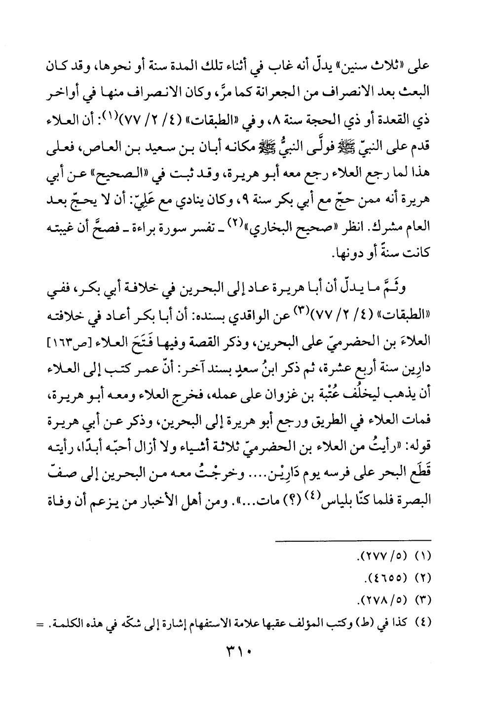على «ثلاث سنين» يدلّ أنه غاب في أثناء تلك المدة سنة أو نحوها، وقد كان البعث بعد الانصراف من الجعرانة كما مرَّ، وكان الانصراف منها في أواخر ذي القعدة أو ذي الحجة سنة ٨، وفي «الطبقات» (٤/ ٢/٧٧) (¬١): أن العلاء قدم على النبيّ - صلى الله عليه وسلم - فولَّى النبيُّ - صلى الله عليه وسلم - مكانه أبان بن سعيد بن العاص، فعلى هذا لما رجع العلاء رجع معه أبو هريرة، وقد ثبت في «الصحيح» عن أبي هريرة أنه ممن حجّ مع أبي بكر سنة ٩، وكان ينادي مع عَلِيّ: أن لا يحجّ بعد العام مشرك. انظر «صحيح البخاري» (¬٢) ــ تفسر سورة براءة ــ فصحَّ أن غيبته كانت سنةً أو دونها.