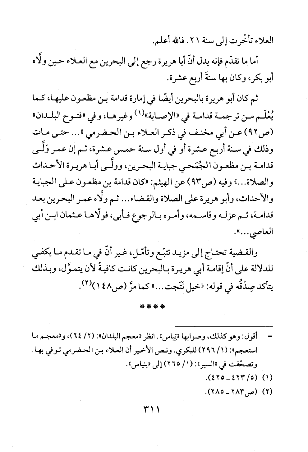 أما ما تقدّم فإنه يدل أنّ أبا هريرة رجع إلى البحرين مع العلاء حين ولَّاه أبو بكر، وكان بها سنةَ أربع عشرة.