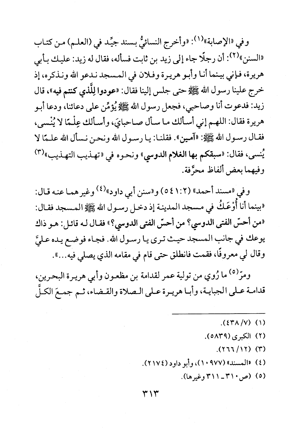 وفي «الإصابة» (¬١): «وأخرج النسائيُّ بسند جيِّد في (العلم) من كتاب «السنن» (¬٢): أن رجلًا جاء إلى زيد بن ثابت فسأله، فقال له زيد: عليك بأبي هريرة، فإني بينما أنا وأبو هريرة وفلان في المسجد ندعو الله ونذكره، إذ خرج علينا رسول الله - صلى الله عليه وسلم - حتى جلس إلينا فقال: «عودوا لِلَّذي كنتم فيه»، قال زيد: فدعوت أنا وصاحبي، فجعل رسول الله - صلى الله عليه وسلم - يُؤمِّن على دعائنا، ودعا أبو هريرة فقال: اللهم إني أسألك ما سأل صاحبايَ، وأسألك عِلْمًا لا يُنْسى، فقال رسول الله - صلى الله عليه وسلم -: «آمين». فقلنا: يا رسول الله ونحن نسأل الله علمًا لا يُنسى، فقال: «سبقكم بها الغلام الدوسي» ونحوه في «تهذيب التهذيب» (¬٣) وفيهما بعض ألفاظ محرَّفة.