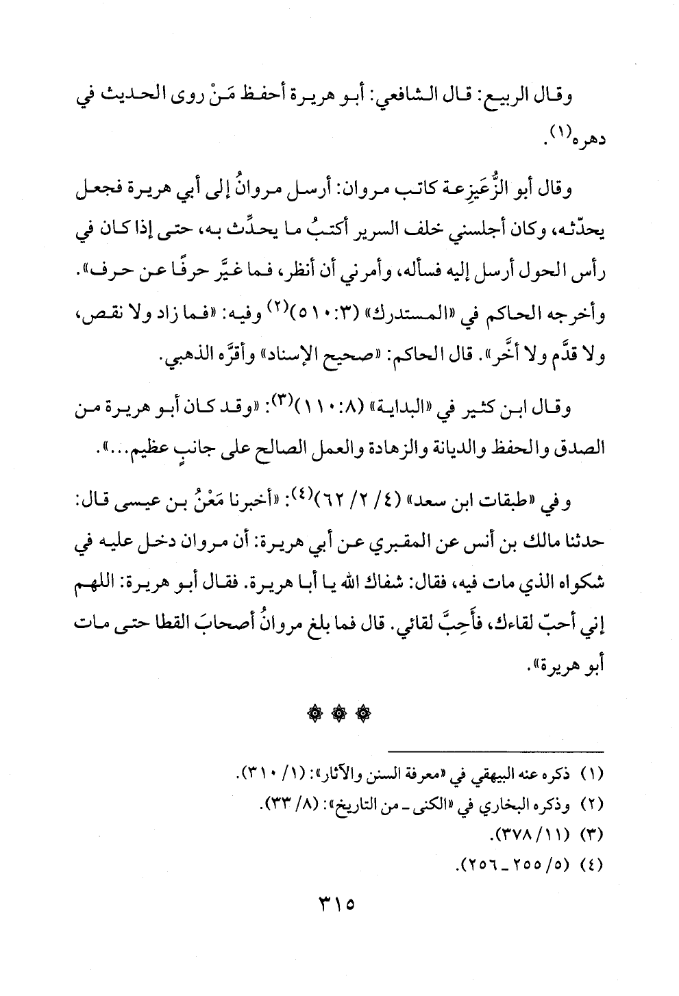 وقال أبو الزُّعَيزِعة كاتب مروان: أرسل مروانُ إلى أبي هريرة فجعل يحدّثه، وكان أجلسني خلف السرير أكتبُ ما يحدِّث به، حتى إذا كان في رأس الحول أرسل إليه فسأله، وأمرني أن أنظر، فما غيَّر حرفًا عن حرف». وأخرجه الحاكم في «المستدرك» (٥١٠: ٣) (¬٢) وفيه: «فما زاد ولا نقص، ولا قدَّم ولا أخَّر». قال الحاكم: «صحيح الإسناد» وأقرَّه الذهبي.