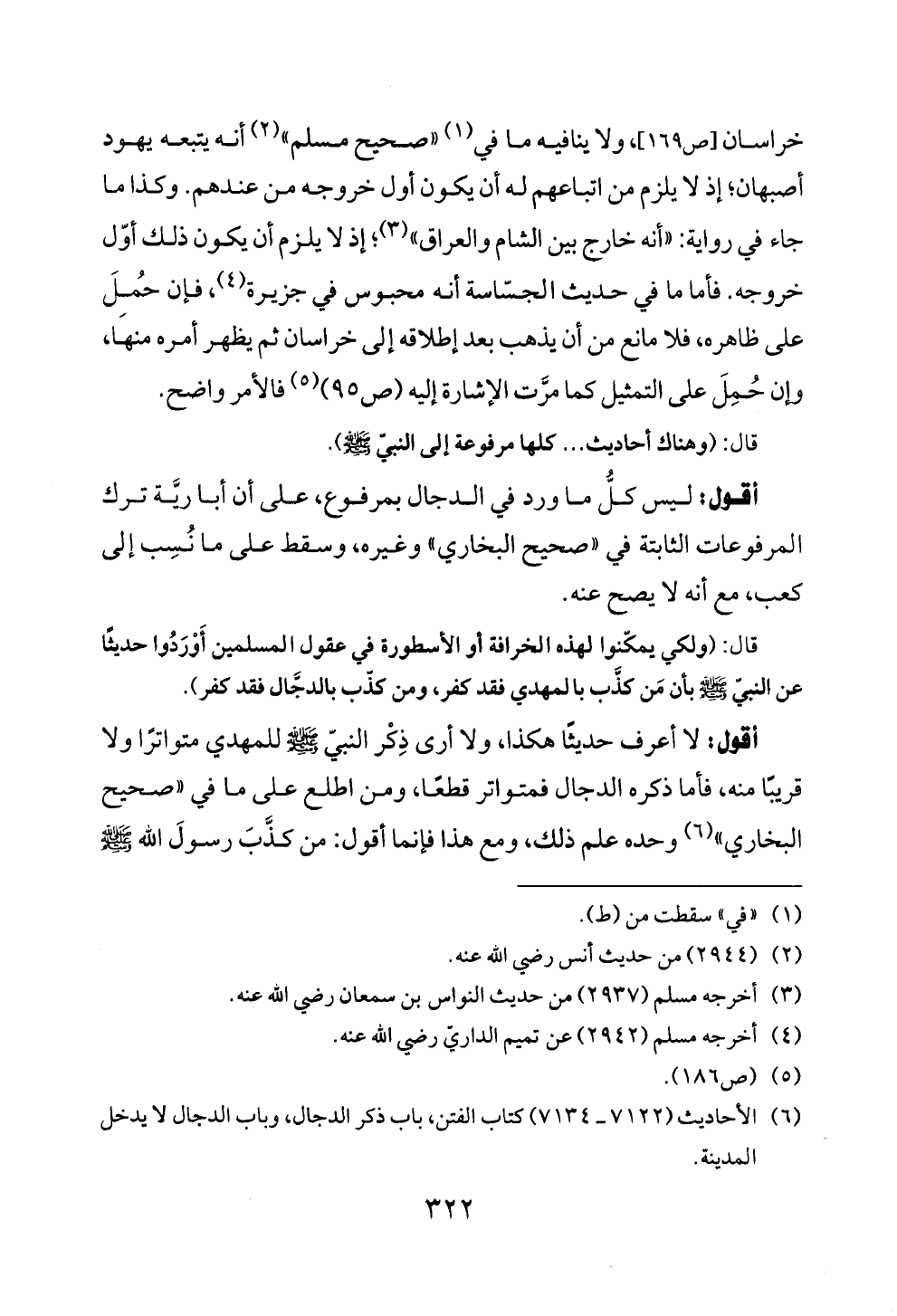 خراسان [ص ١٦٩]، ولا ينافيه ما في (¬١) «صحيح مسلم» (¬٢) أنه يتبعه يهود أصبهان؛ إذ لا يلزم من اتباعهم له أن يكون أول خروجه من عندهم. وكذا ما جاء في رواية: «أنه خارج بين الشام والعراق» (¬٣)؛ إذ لا يلزم أن يكون ذلك أوّل خروجه. فأما ما في حديث الجسّاسة أنه محبوس في جزيرة (¬٤)، فإن حُمِلَ على ظاهره، فلا مانع من أن يذهب بعد إطلاقه إلى خراسان ثم يظهر أمره منها، وإن حُمِلَ على التمثيل كما مرَّت الإشارة إليه (ص ٩٥) (¬٥) فالأمر واضح.