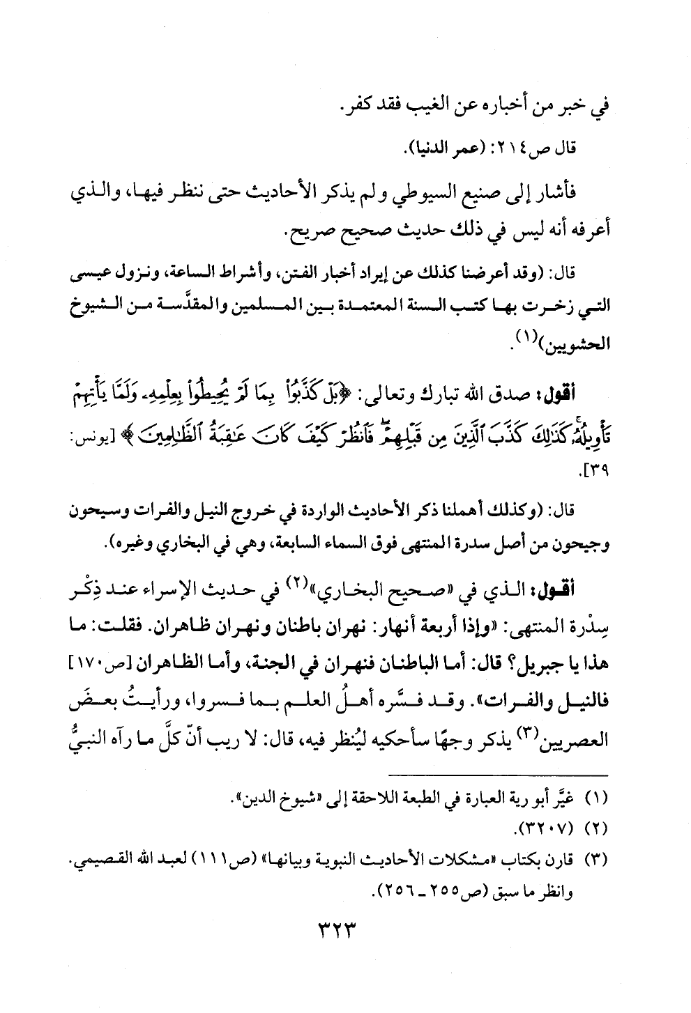 قال: (وقد أعرضنا كذلك عن إيراد أخبار الفتن، وأشراط الساعة، ونزول عيسى التي زخرت بها كتب السنة المعتمدة بين المسلمين والمقدَّسة من الشيوخ الحشويين) (¬١).