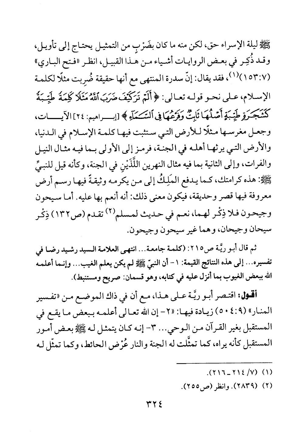 - صلى الله عليه وسلم - ليلة الإسراء حق، لكن منه ما كان بضَرْبٍ من التمثيل يحتاج إلى تأويل، وقد ذُكِر في بعض الروايات أشياء من هذا القبيل، انظر «فتح الباري» (١٥٣: ٧) (¬١)، فقد يقال: إنّ سدرة المنتهى مع أنها حقيقة ضُرِبت مثلًا لكلمة الإسلام، على نحو قوله تعالى: {أَلَمْ تَرَ كَيْفَ ضَرَبَ اللَّهُ مَثَلًا كَلِمَةً طَيِّبَةً كَشَجَرَةٍ طَيِّبَةٍ أَصْلُهَا ثَابِتٌ وَفَرْعُهَا فِي السَّمَاءِ} [إبراهيم: ٢٤] الآيات، وجعل مغرسها مثلًا للأرض التي ستثبت فيها كلمة الإسلام في الدنيا، والأرض التي يرثها أهله في الجنة، فرمز إلى الأولى بما فيه مثال النيل والفرات، وإلى الثانية بما فيه مثال النهرين اللَّذَيْنِ في الجنة، وكأنه قيل للنبيِّ - صلى الله عليه وسلم -: هذه كرامتك، كما يدفع المَلِكُ إلى من يكرمه وثيقةً فيها رسم أرض معروفة فيها قصر وحديقة، فيكون معنى ذلك: أنه أنعم بها عليه. أما سيحون وجيحون فلا ذِكْر لهما، نعم في حديث لمسلم (¬٢) تقدم (ص ١٣٢) ذِكْر سيحان وجيحان، وهما غير سيحون وجيحون.