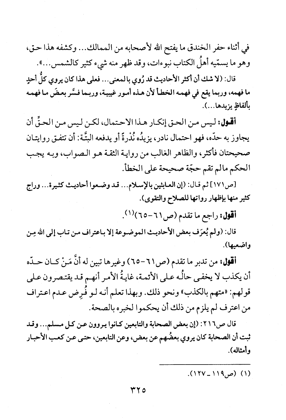 [ص ١٧١] ثم قال: (إن العابثين بالإسلام ... قد وضعوا أحاديث كثيرة ... وراج كثير منها بإظهار رواتها للصلاح والتقوى).