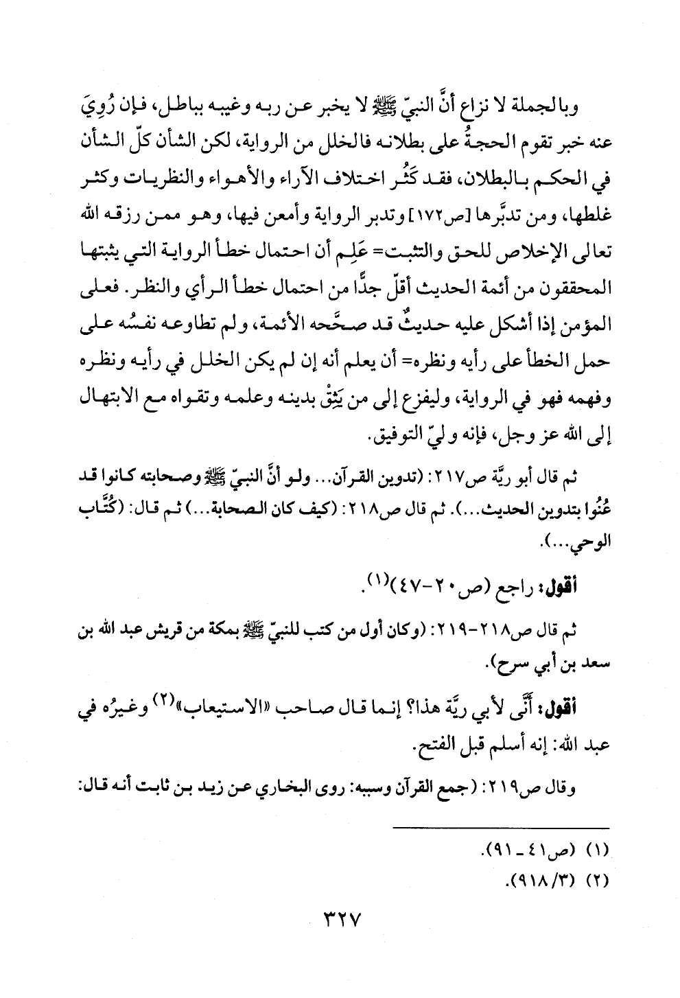 ثم قال أبو ريَّة ص ٢١٧: (تدوين القرآن ... ولو أنَّ النبيّ - صلى الله عليه وسلم - وصحابته كانوا قد عُنُوا بتدوين الحديث ... ). ثم قال ص ٢١٨: (كيف كان الصحابة ... ) ثم قال: (كُتَّاب الوحي ... ).