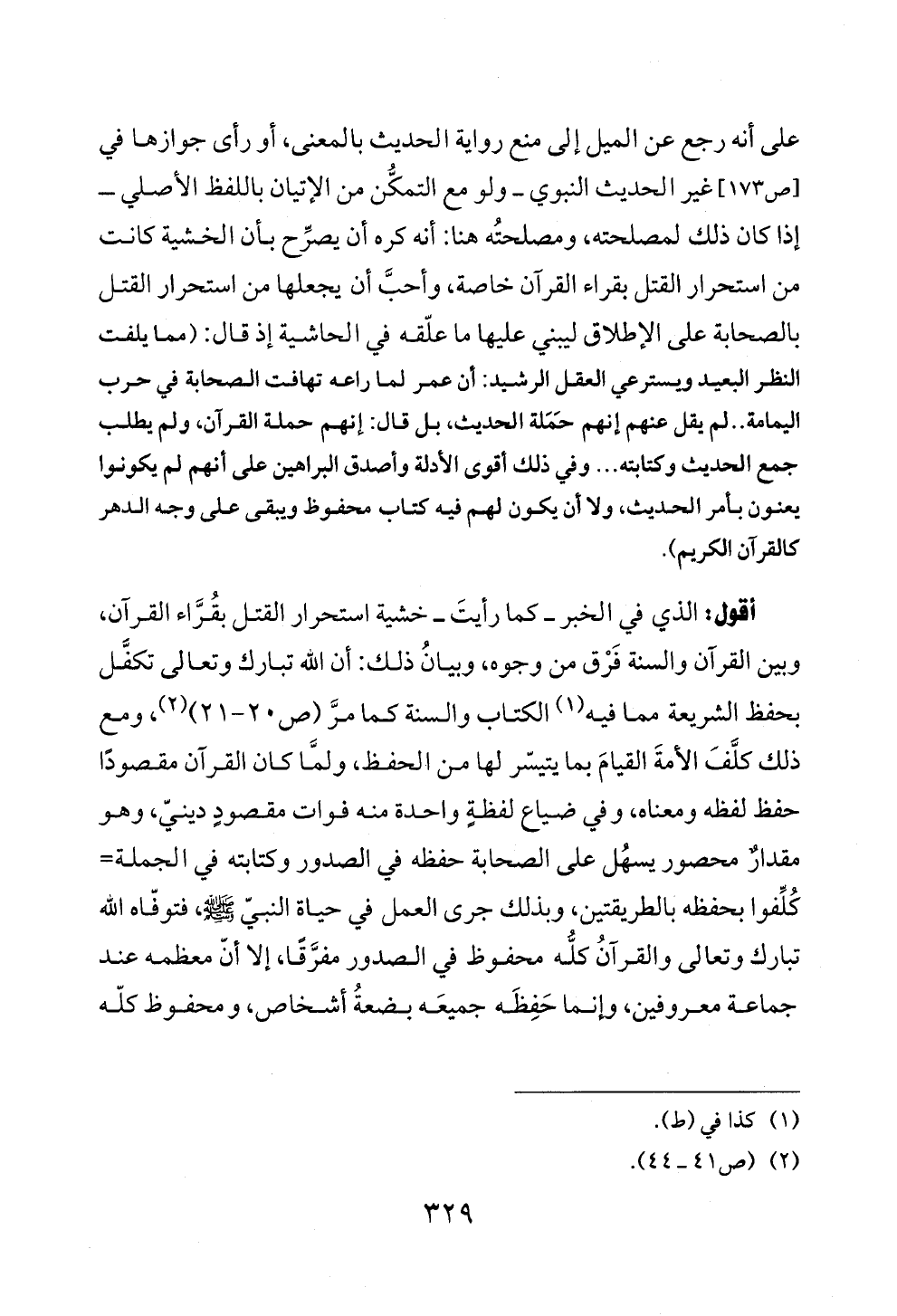 أقول: الذي في الخبر ــ كما رأيتَ ــ خشية استحرار القتل بقُرَّاء القرآن، وبين القرآن والسنة فَرْق من وجوه، وبيانُ ذلك: أن الله تبارك وتعالى تكفَّل بحفظ الشريعة مما فيه (¬١) الكتاب والسنة كما مرَّ (ص ٢٠ - ٢١) (¬٢)، ومع ذلك كلَّفَ الأمةَ القيامَ بما يتيسّر لها من الحفظ، ولمَّا كان القرآن مقصودًا حفظ لفظه ومعناه، وفي ضياع لفظةٍ واحدة منه فوات مقصودٍ دينيّ، وهو مقدارٌ محصور يسهُل على الصحابة حفظه في الصدور وكتابته في الجملة= كُلِّفوا بحفظه بالطريقتين، وبذلك جرى العمل في حياة النبيّ - صلى الله عليه وسلم -، فتوفّاه الله تبارك وتعالى والقرآنُ كلُّه محفوظ في الصدور مفرَّقًا، إلا أنّ معظمه عند جماعة معروفين، وإنما حَفِظَه جميعَه بضعةُ أشخاص، ومحفوظ كلّه