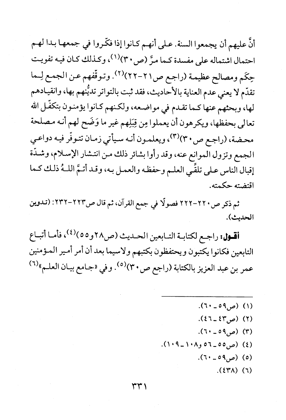 ثم ذكر ص ٢٢٠ - ٢٢٢ فصولًا في جمع القرآن، ثم قال ص ٢٢٣ - ٢٣٢: (تدوين الحديث).