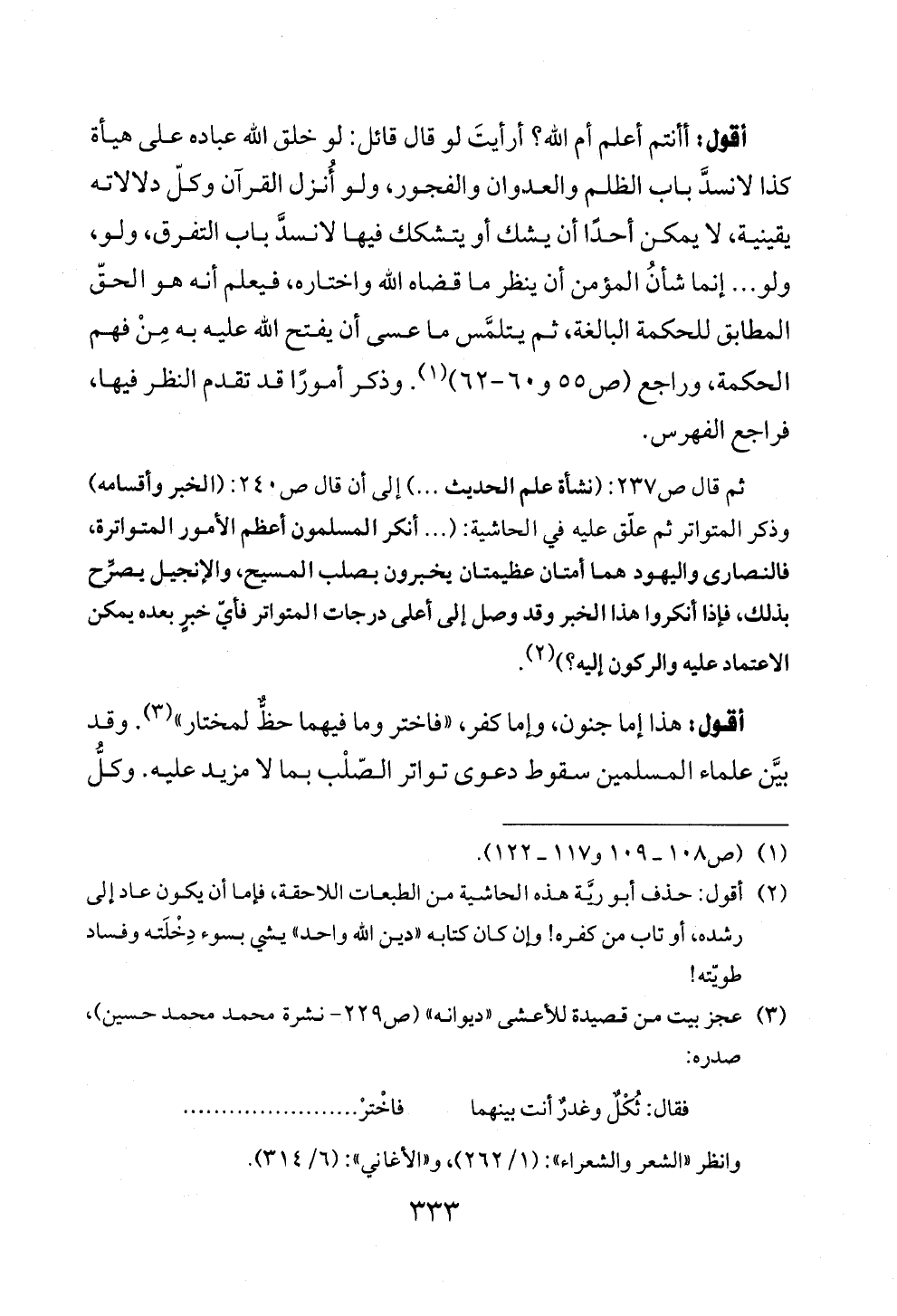 ثم قال ص ٢٣٧: (نشأة علم الحديث ... ) إلى أن قال ص ٢٤٠: (الخبر وأقسامه) وذكر المتواتر ثم علّق عليه في الحاشية: ( ... أنكر المسلمون أعظم الأمور المتواترة، فالنصارى واليهود هما أمتان عظيمتان يخبرون بصلب المسيح، والإنجيل يصرِّح بذلك، فإذا أنكروا هذا الخبر وقد وصل إلى أعلى درجات المتواتر فأيّ خبرٍ بعده يمكن الاعتماد عليه والركون إليه؟) (¬٢).