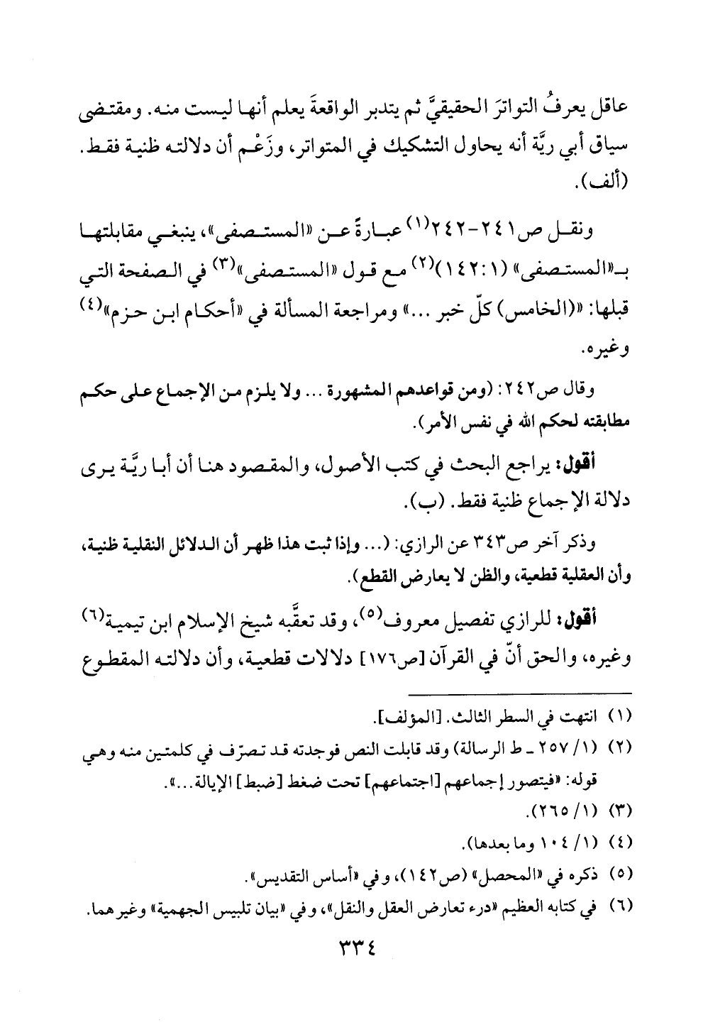 وذكر آخر ص ٣٤٣ عن الرازي: ( ... وإذا ثبت هذا ظهر أن الدلائل النقلية ظنية، وأن العقلية قطعية، والظن لا يعارض القطع).