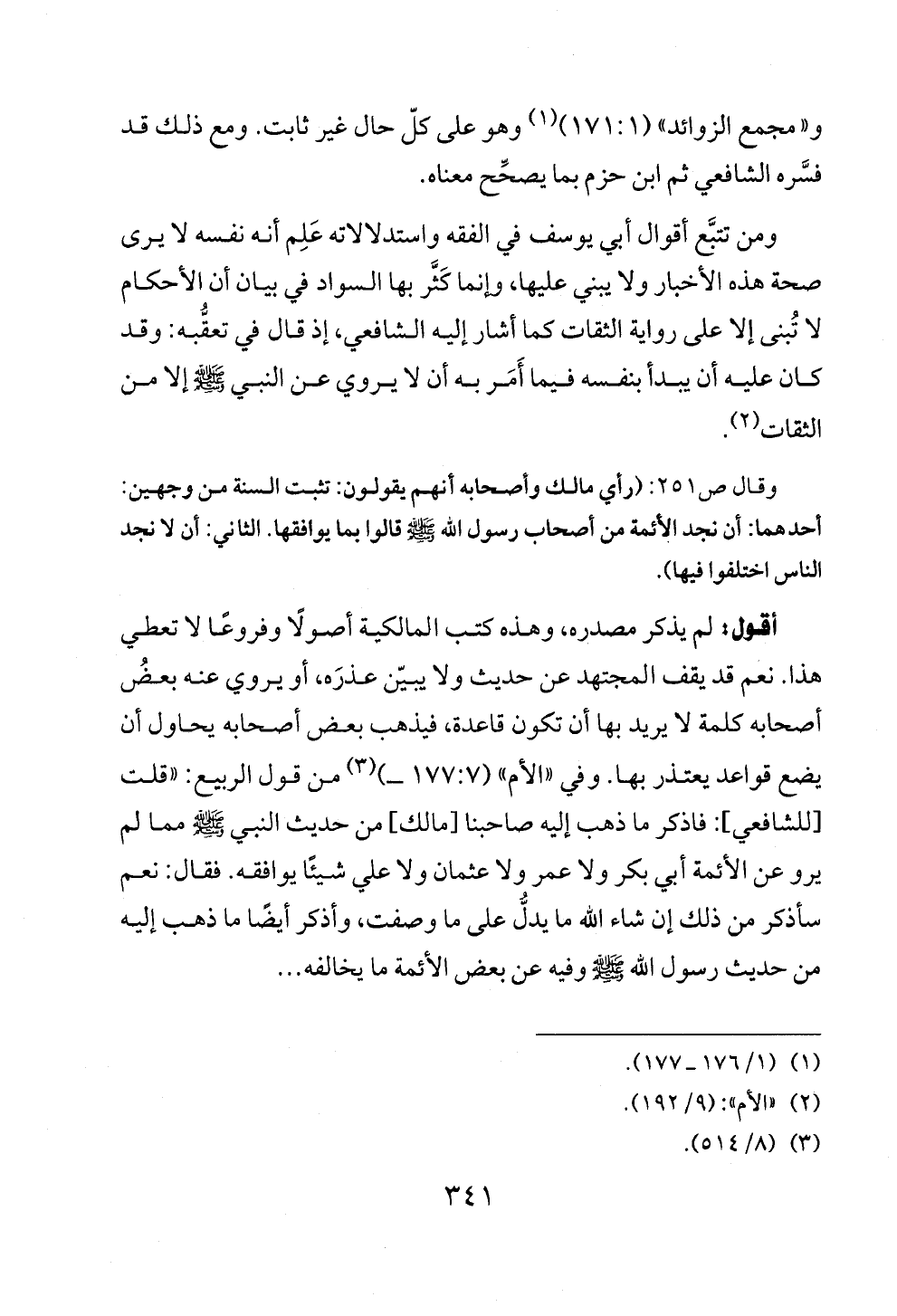 وقال ص ٢٥١: (رأي مالك وأصحابه أنهم يقولون: تثبت السنة من وجهين: أحدهما: أن نجد الأئمة من أصحاب رسول الله - صلى الله عليه وسلم - قالوا بما يوافقها. الثاني: أن لا نجد الناس اختلفوا فيها).