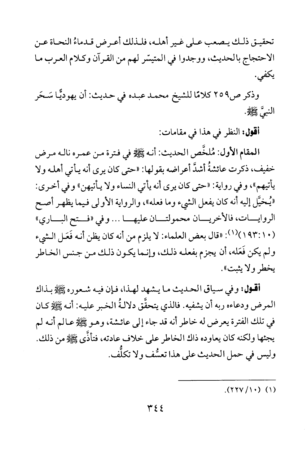 المقام الأول: مُلخَّص الحديث: أنه - صلى الله عليه وسلم - في فترة من عمره ناله مرض خفيف، ذكرت عائشةُ أشدَّ أعراضه بقولها: «حتى كان يرى أنه يأتي أهله ولا يأتيهم»، وفي رواية: «حتى كان يرى أنه يأتي النساء ولا يأتيهن» وفي أخرى: «يُخيَّل إليه أنه كان يفعل الشيء وما فعله»، والرواية الأولى فيما يظهر أصح الروايات، فالأخريان محمولتان عليها ... وفي «فتح الباري» (١٩٣: ١٠) (¬١): «قال بعض العلماء: لا يلزم من أنه كان يظن أنه فَعَل الشيء ولم يكن فَعَله، أن يجزم بفعله ذلك، وإنما يكون ذلك من جنس الخاطر يخطر ولا يثبت».