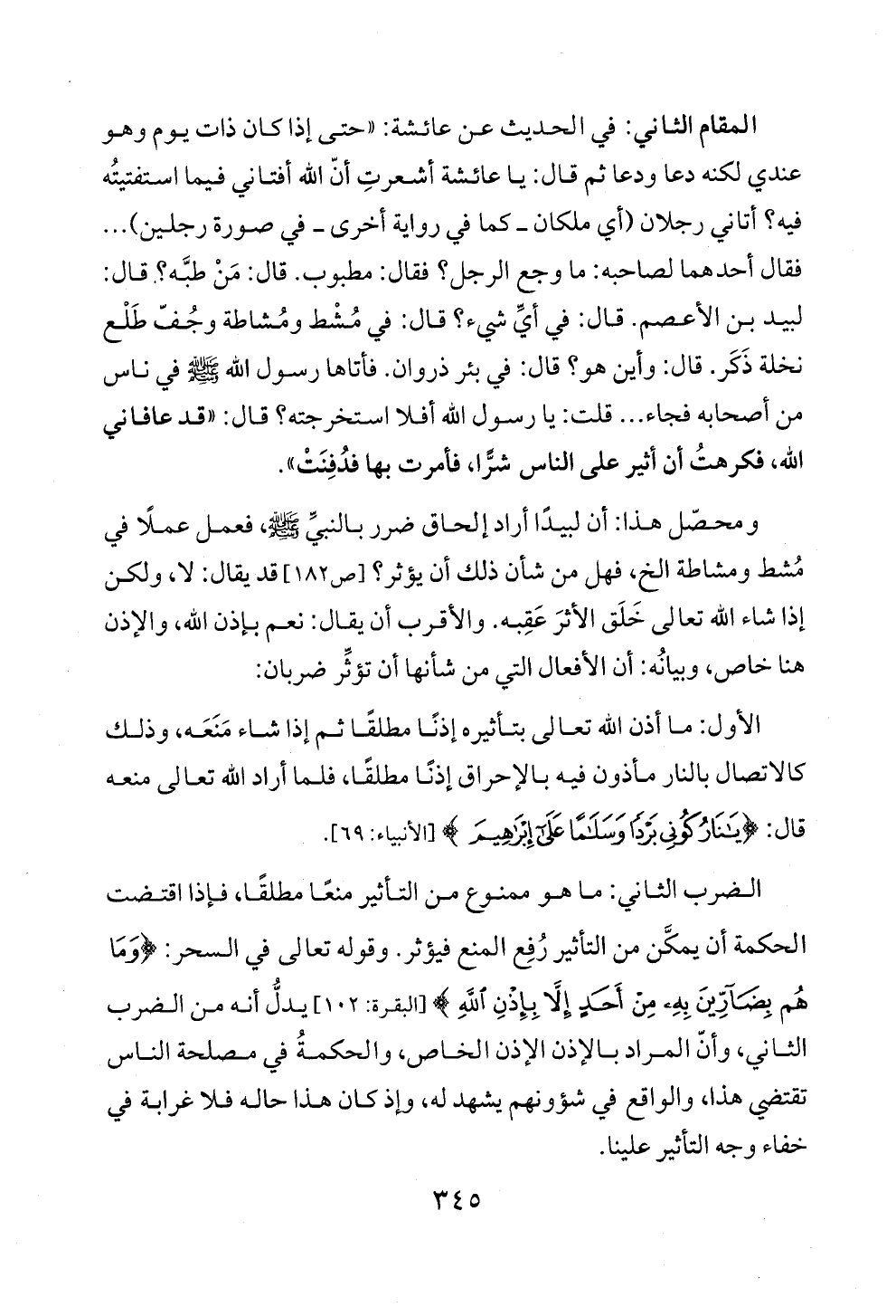ومحصّل هذا: أن لبيدًا أراد إلحاق ضرر بالنبيِّ - صلى الله عليه وسلم -، فعمل عملًا في مُشط ومشاطة الخ، فهل من شأن ذلك أن يؤثر؟ [ص ١٨٢] قد يقال: لا، ولكن إذا شاء الله تعالى خَلَق الأثرَ عَقِبه. والأقرب أن يقال: نعم بإذن الله، والإذن هنا خاص، وبيانُه: أن الأفعال التي من شأنها أن تؤثِّر ضربان: