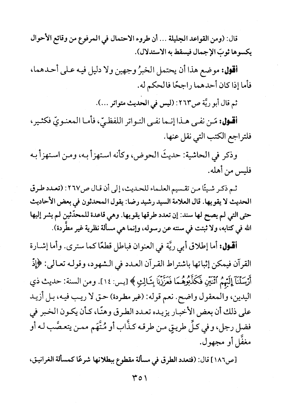 ثم ذكر شيئًا من تقسيم العلماء للحديث، إلى أن قال ص ٢٦٧: (تعدد طرق الحديث لا يقويها. قال العلامة السيد رشيد رضا: يقول المحدثون في بعض الأحاديث حتى التي لم يصح لها سند: إن تعدد طرقها يقويها. وهي قاعدة للمحدّثين لم يشر إليها الله في كتابه، ولا ثبتت في سنته عن رسوله، وإنما هي مسألة نظرية غير مطَّردة).