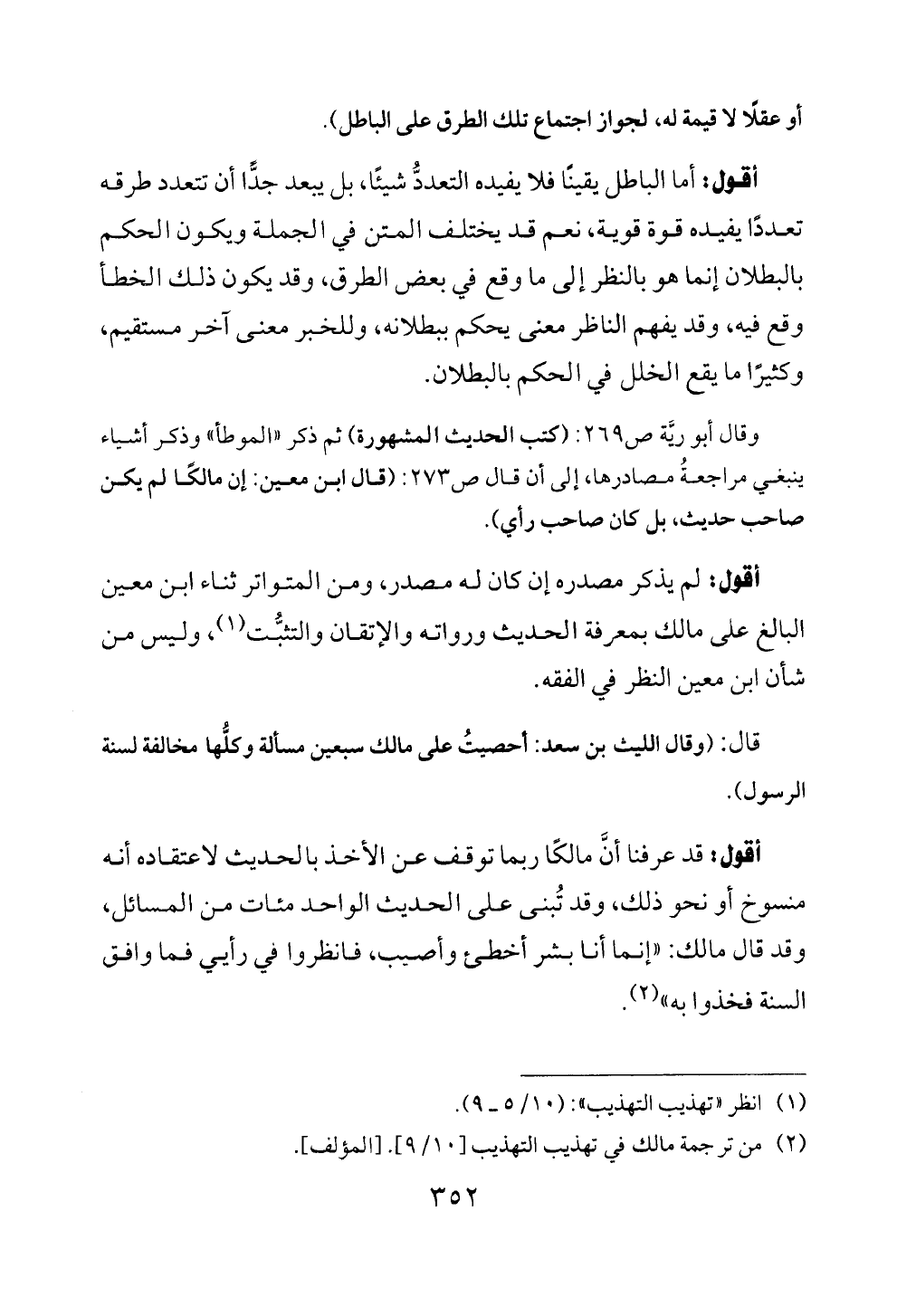 أقول: قد عرفنا أنَّ مالكًا ربما توقف عن الأخذ بالحديث لاعتقاده أنه منسوخ أو نحو ذلك، وقد تُبنى على الحديث الواحد مئات من المسائل، وقد قال مالك: «إنما أنا بشر أخطئ وأصيب، فانظروا في رأيي فما وافق السنة فخذوا به» (¬٢).