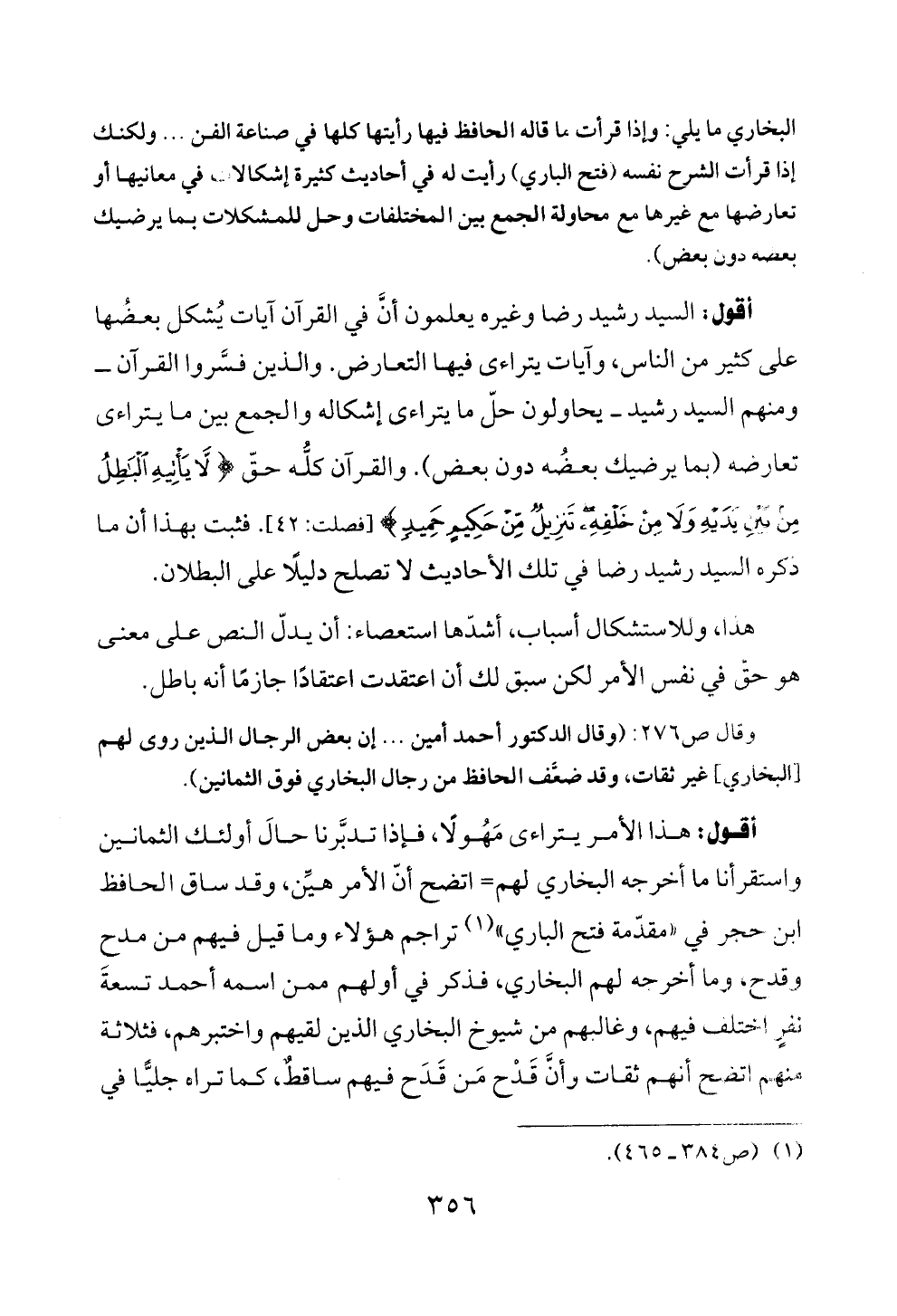 وقال ص ٢٧٦: (وقال الدكتور أحمد أمين ... إن بعض الرجال الذين روى لهم [البخاري] غير ثقات، وقد ضعَّف الحافظ من رجال البخاري فوق الثمانين).