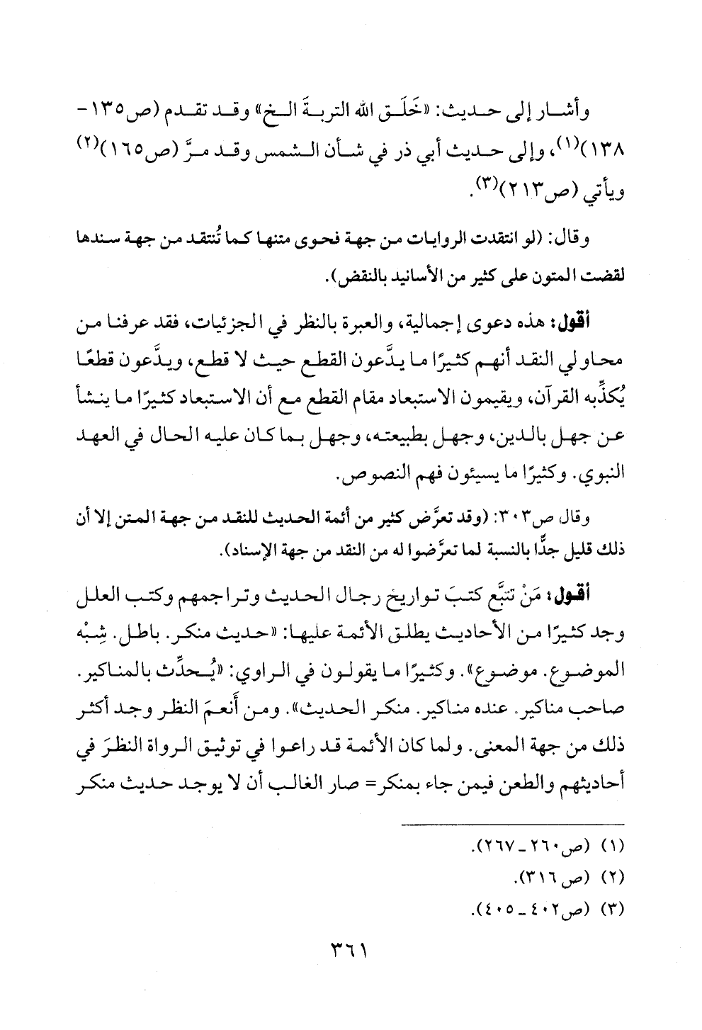 وقال ص ٣٠٣: (وقد تعرَّض كثير من أئمة الحديث للنقد من جهة المتن إلا أن ذلك قليل جدًّا بالنسبة لما تعرَّضوا له من النقد من جهة الإسناد).
