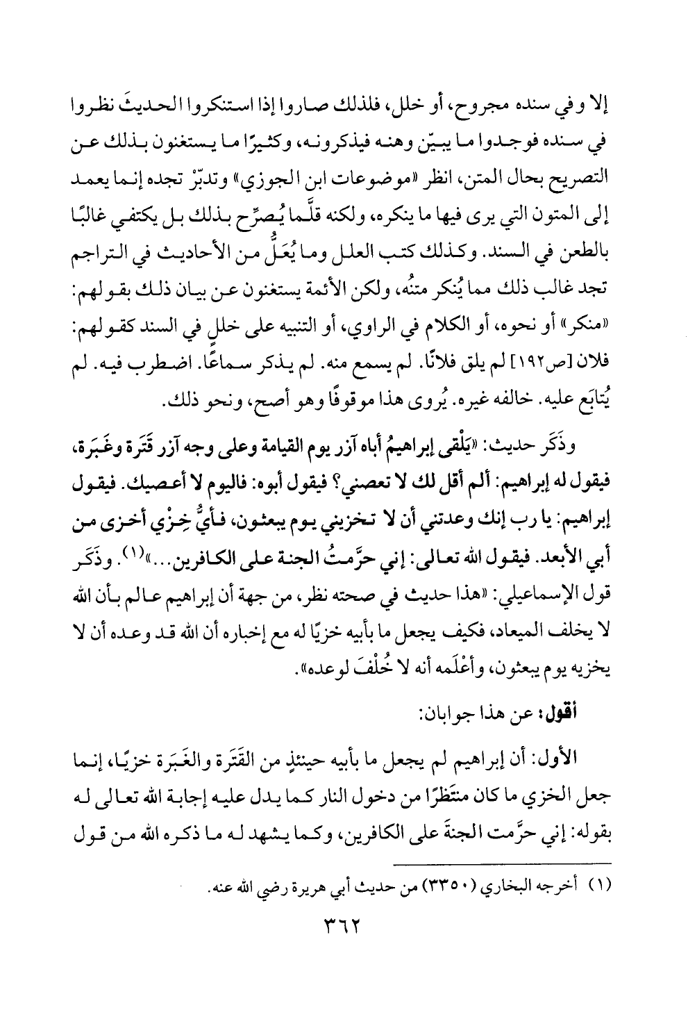 وذَكَر حديث: «يَلْقى إبراهيمُ أباه آزر يوم القيامة وعلى وجه آزر قَتَرة وغَبَرة، فيقول له إبراهيم: ألم أقل لك لا تعصني؟ فيقول أبوه: فاليوم لا أعصيك. فيقول إبراهيم: يا رب إنك وعدتني أن لا تخزيني يوم يبعثون، فأيُّ خِزْي أخزى من أبي الأبعد. فيقول الله تعالى: إني حرَّمتُ الجنة على الكافرين ... » (¬١). وذَكَر قول الإسماعيلي: «هذا حديث في صحته نظر، من جهة أن إبراهيم عالم بأن الله لا يخلف الميعاد، فكيف يجعل ما بأبيه خزيًا له مع إخباره أن الله قد وعده أن لا يخزيه يوم يبعثون، وأعْلَمه أنه لا خُلْفَ لوعده».