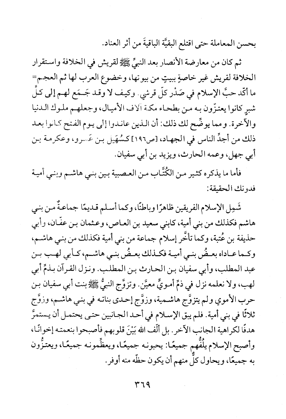 ثم كان من معارضة الأنصار بعد النبيِّ - صلى الله عليه وسلم - لقريش في الخلافة واستقرار الخلافة لقريش غير خاصةٍ ببيتٍ من بيوتها، وخضوع العرب لها ثم العجم= ما أكّد حبَّ الإسلام في صَدْر كلّ قرشي. وكيف لا وقد جَمَع لهم إلى كلِّ شبرٍ كانوا يعتزّون به من بطحاء مكة آلاف الأميال، وجعلهم ملوك الدنيا والآخرة. ومما يوضِّح لك ذلك: أن الذين عاندوا إلى يوم الفتح كانوا بعد ذلك من أجدِّ الناس في الجهاد، [ص ١٩٦] كسُهَيل بن عَمرو، وعكرمة بن أبي جهل، وعمه الحارث، ويزيد بن أبي سفيان.