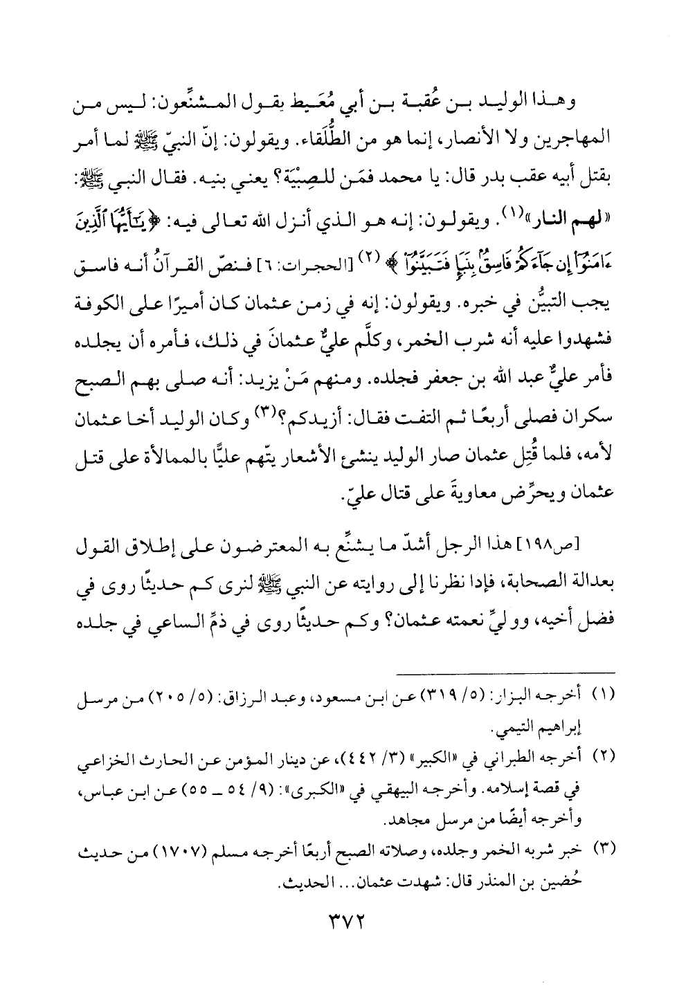 [ص ١٩٨] هذا الرجل أشدّ ما يشنِّع به المعترضون على إطلاق القول بعدالة الصحابة، فإذا نظرنا إلى روايته عن النبي - صلى الله عليه وسلم - لنرى كم حديثًا روى في فضل أخيه، ووليِّ نعمته عثمان؟ وكم حديثًا روى في ذمِّ الساعي في جلده