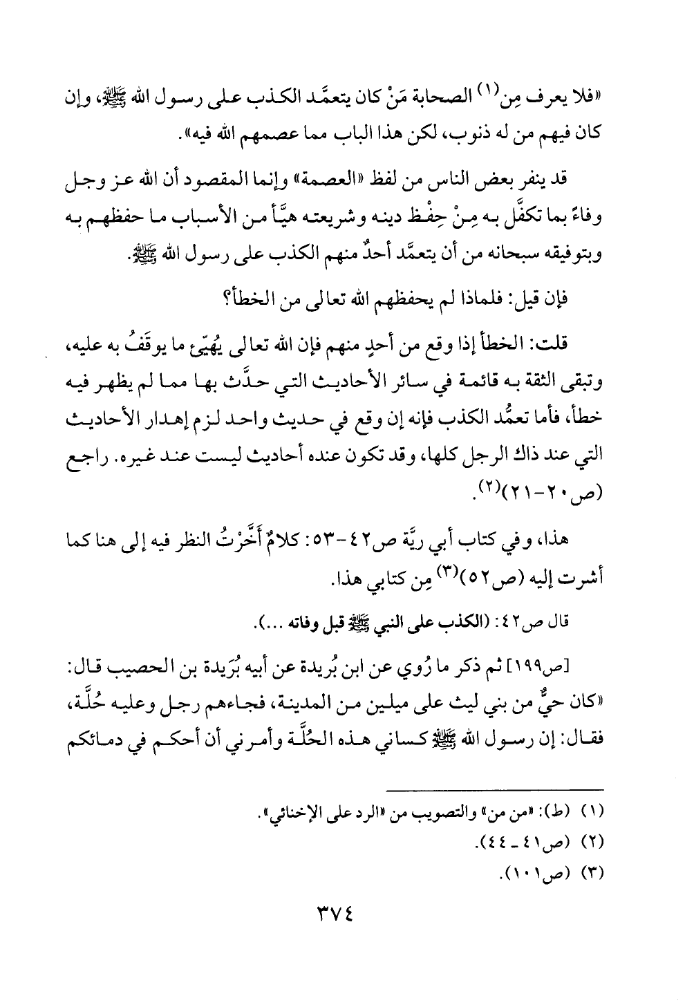 قلت: الخطأ إذا وقع من أحدٍ منهم فإن الله تعالى يُهيّئ ما يوقَفُ به عليه، وتبقى الثقة به قائمة في سائر الأحاديث التي حدَّث بها مما لم يظهر فيه خطأ، فأما تعمُّد الكذب فإنه إن وقع في حديث واحد لزم إهدار الأحاديث التي عند ذاك الرجل كلها، وقد تكون عنده أحاديث ليست عند غيره. راجع (ص ٢٠ - ٢١) (¬٢).