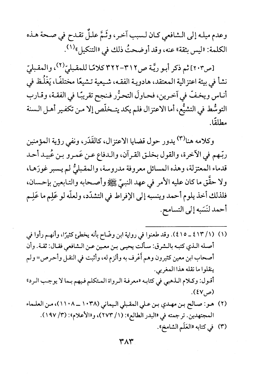 وكلامه هنا (¬٣) يدور حول قضايا الاعتزال، كالقَدَر، ونفي رؤية المؤمنين ربّهم في الآخرة، والقول بخلق القرآن، والدفاع عن عَمرو بن عُبيد أحد قدماء المعتزلة، وهذه المسائل معروفة مدروسة، والمقبليُّ لم يسبر غورَها، ولا حقَّق ما كان عليه الأمر في عهد النبيّ - صلى الله عليه وسلم - وأصحابه والتابعين بإحسان، فلذلك أخذ يلوم أحمد وينسبه إلى الإفراط في التشدّد، ولعلّه لو عَلِم ما عَلِم أحمد لنَسَبه إلى التسامح.