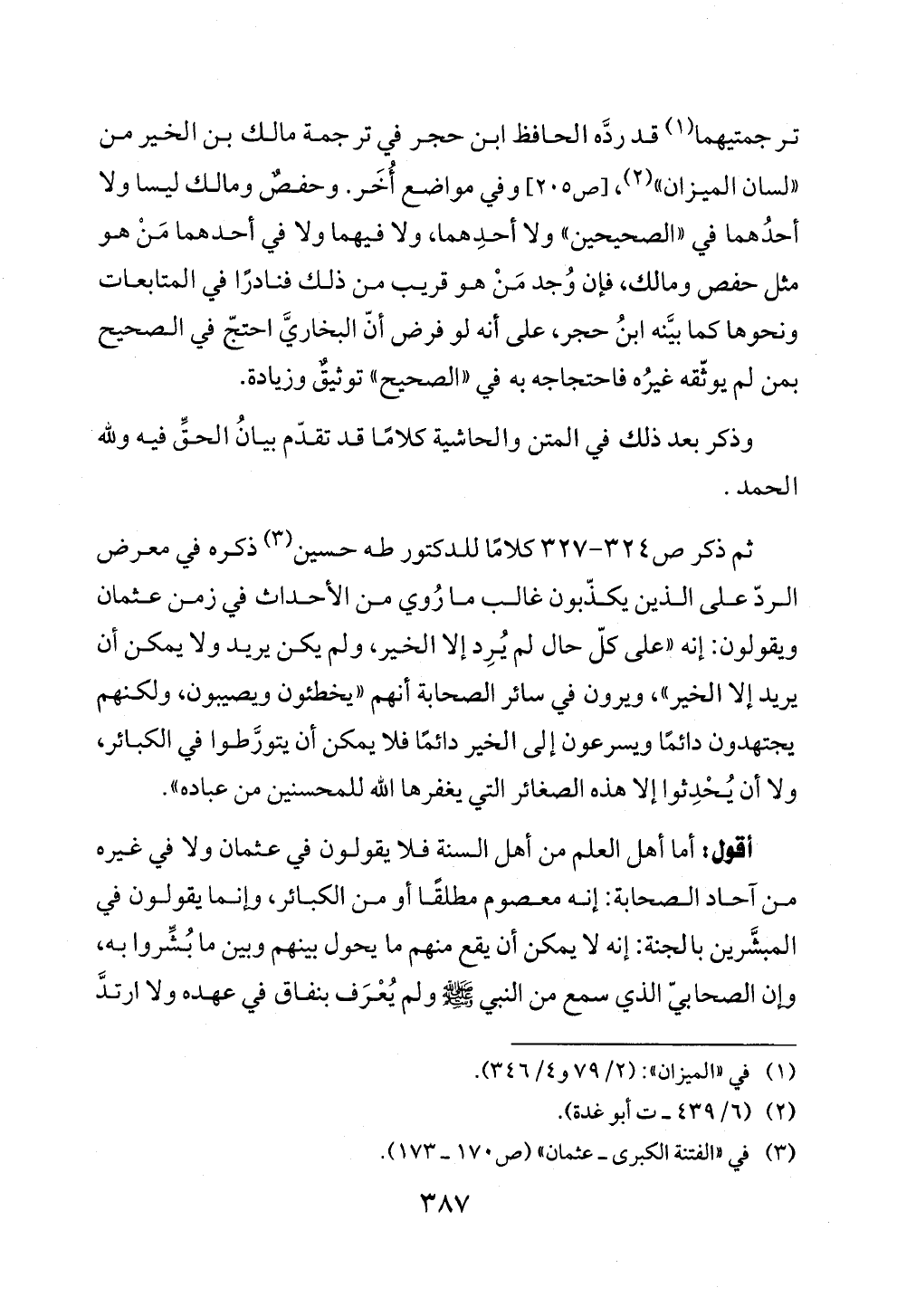 ثم ذكر ص ٣٢٤ - ٣٢٧ كلامًا للدكتور طه حسين (¬٣) ذكره في معرض الردّ على الذين يكذّبون غالب ما رُوي من الأحداث في زمن عثمان ويقولون: إنه «على كلّ حال لم يُرِد إلا الخير، ولم يكن يريد ولا يمكن أن يريد إلا الخير»، ويرون في سائر الصحابة أنهم «يخطئون ويصيبون، ولكنهم يجتهدون دائمًا ويسرعون إلى الخير دائمًا فلا يمكن أن يتورَّطوا في الكبائر، ولا أن يُحْدِثوا إلا هذه الصغائر التي يغفرها الله للمحسنين من عباده».