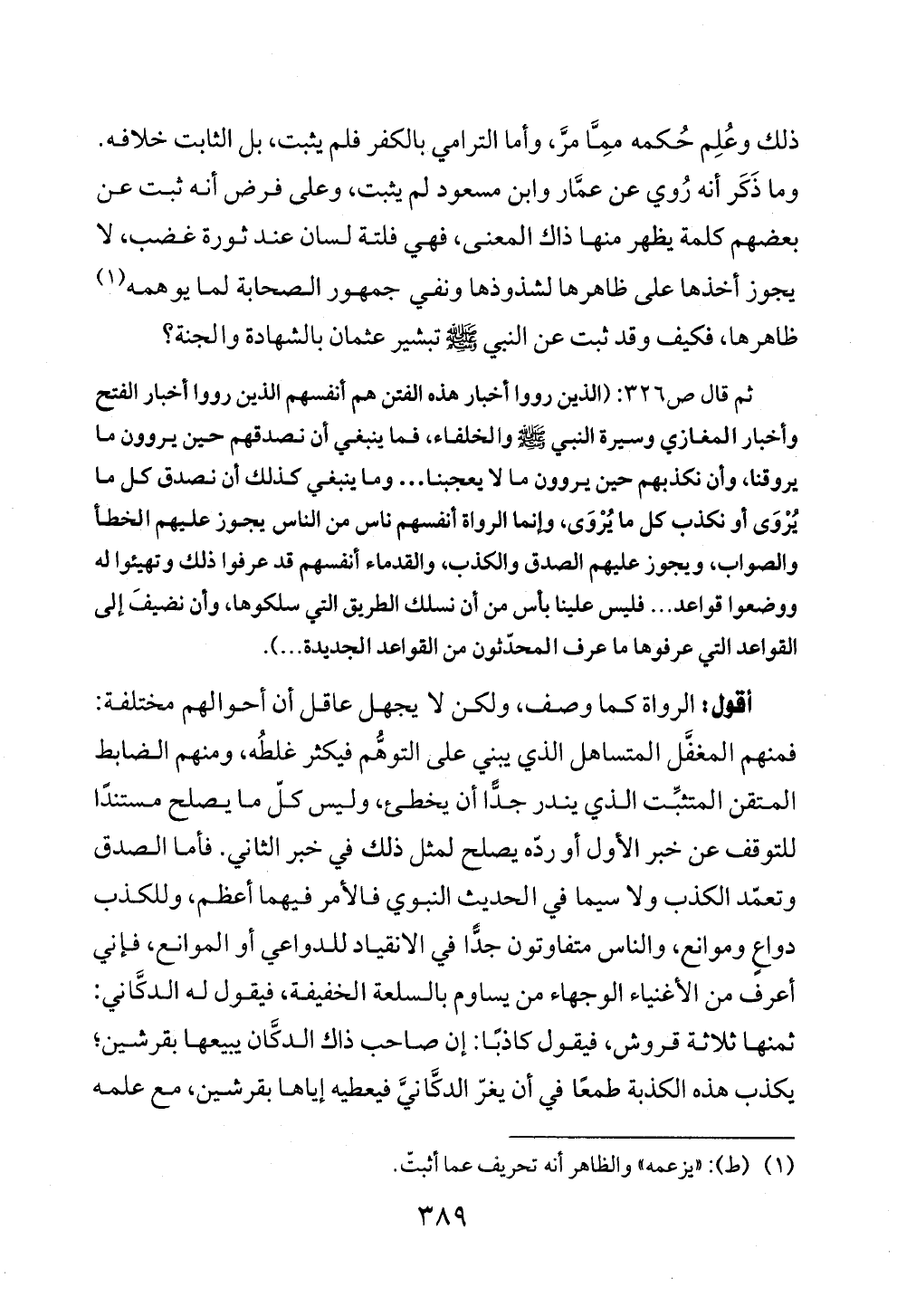 أقول: الرواة كما وصف، ولكن لا يجهل عاقل أن أحوالهم مختلفة: فمنهم المغفَّل المتساهل الذي يبني على التوهُّم فيكثر غلطُه، ومنهم الضابط المتقن المتثبِّت الذي يندر جدًّا أن يخطئ، وليس كلّ ما يصلح مستندًا للتوقف عن خبر الأول أو ردّه يصلح لمثل ذلك في خبر الثاني. فأما الصدق وتعمّد الكذب ولا سيما في الحديث النبوي فالأمر فيهما أعظم، وللكذب دواعٍ وموانع، والناس متفاوتون جدًّا في الانقياد للدواعي أو الموانع، فإني أعرف من الأغنياء الوجهاء من يساوم بالسلعة الخفيفة، فيقول له الدكَّاني: ثمنها ثلاثة قروش، فيقول كاذبًا: إن صاحب ذاك الدكَّان يبيعها بقرشين؛ يكذب هذه الكذبة طمعًا في أن يغرّ الدكَّانيَّ فيعطيه إياها بقرشين، مع علمه