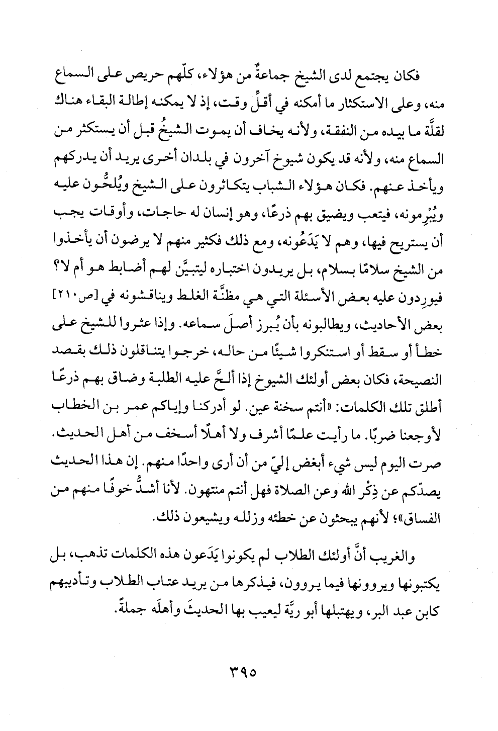 فكان يجتمع لدى الشيخ جماعةٌ من هؤلاء، كلّهم حريص على السماع منه، وعلى الاستكثار ما أمكنه في أقلِّ وقت، إذ لا يمكنه إطالة البقاء هناك لقلَّة ما بيده من النفقة، ولأنه يخاف أن يموت الشيخُ قبل أن يستكثر من السماع منه، ولأنه قد يكون شيوخ آخرون في بلدان أخرى يريد أن يدركهم ويأخذ عنهم. فكان هؤلاء الشباب يتكاثرون على الشيخ ويُلحُّون عليه ويُبْرِمونه، فيتعب ويضيق بهم ذرعًا، وهو إنسان له حاجات، وأوقات يجب أن يستريح فيها، وهم لا يَدَعُونه، ومع ذلك فكثير منهم لا يرضون أن يأخذوا من الشيخ سلامًا بسلام، بل يريدون اختباره ليتبيَّن لهم أضابط هو أم لا؟ فيورِدون عليه بعض الأسئلة التي هي مظنَّة الغلط ويناقشونه في [ص ٢١٠] بعض الأحاديث، ويطالبونه بأن يُبرز أصلَ سماعه. وإذا عثروا للشيخ على خطأ أو سقط أو استنكروا شيئًا من حاله، خرجوا يتناقلون ذلك بقصد النصيحة، فكان بعض أولئك الشيوخ إذا ألحَّ عليه الطلبة وضاق بهم ذرعًا أطلق تلك الكلمات: «أنتم سخنة عين. لو أدركنا وإياكم عمر بن الخطاب لأوجعنا ضربًا. ما رأيت علمًا أشرف ولا أهلًا أسخف من أهل الحديث. صرت اليوم ليس شيء أبغض إليّ من أن أرى واحدًا منهم. إن هذا الحديث يصدّكم عن ذِكْر الله وعن الصلاة فهل أنتم منتهون. لأنا أشدُّ خوفًا منهم من الفساق»؛ لأنهم يبحثون عن خطئه وزلله ويشيعون ذلك.