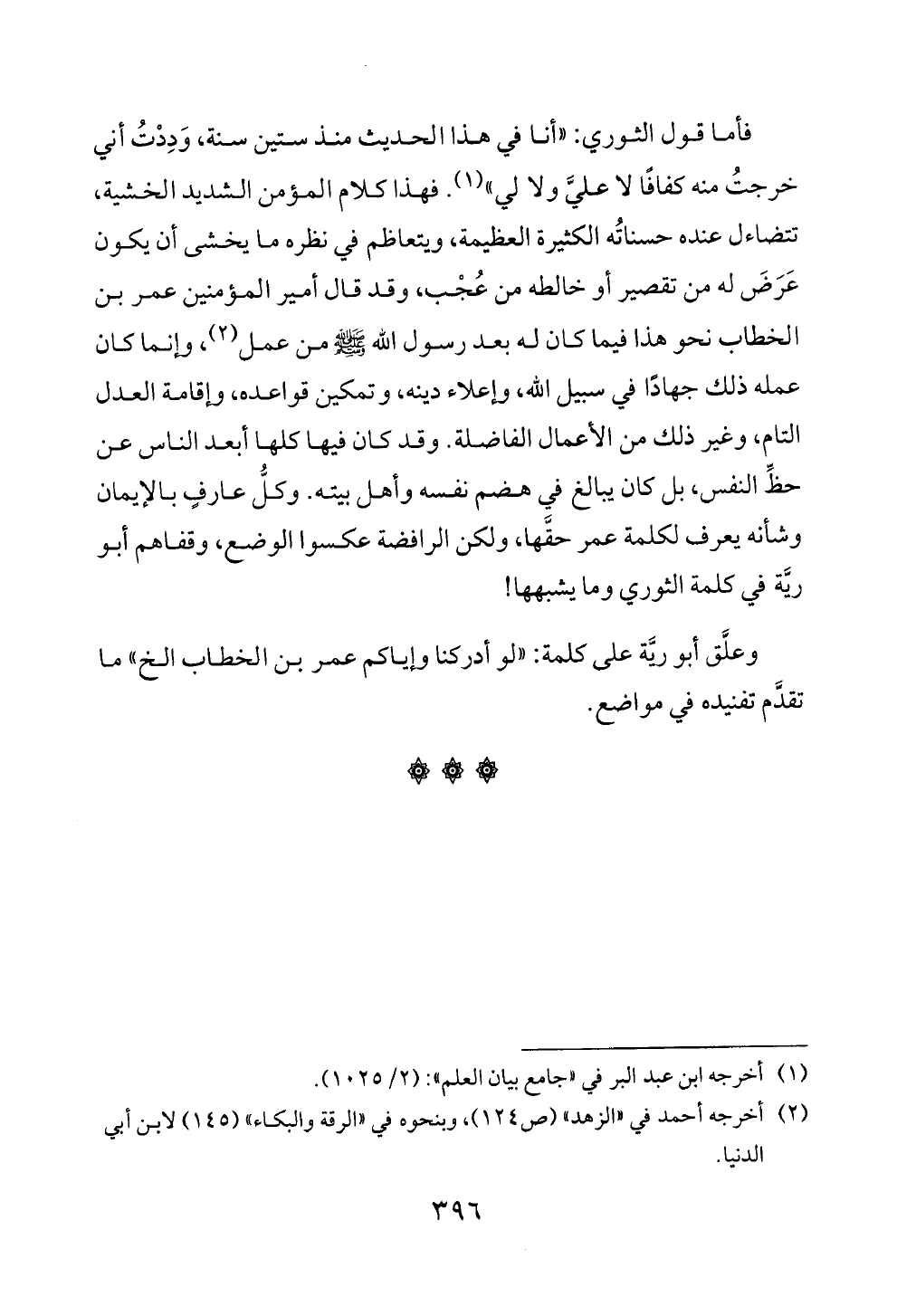 فأما قول الثوري: «أنا في هذا الحديث منذ ستين سنة، وَدِدْتُ أني خرجتُ منه كفافًا لا عليَّ ولا لي» (¬١). فهذا كلام المؤمن الشديد الخشية، تتضاءل عنده حسناتُه الكثيرة العظيمة، ويتعاظم في نظره ما يخشى أن يكون عَرَضَ له من تقصير أو خالطه من عُجْب، وقد قال أمير المؤمنين عمر بن الخطاب نحو هذا فيما كان له بعد رسول الله - صلى الله عليه وسلم - من عمل (¬٢)، وإنما كان عمله ذلك جهادًا في سبيل الله، وإعلاء دينه، وتمكين قواعده، وإقامة العدل التام، وغير ذلك من الأعمال الفاضلة. وقد كان فيها كلها أبعد الناس عن حظِّ النفس، بل كان يبالغ في هضم نفسه وأهل بيته. وكلُّ عارفٍ بالإيمان وشأنه يعرف لكلمة عمر حقَّها، ولكن الرافضة عكسوا الوضع، وقفاهم أبو ريَّة في كلمة الثوري وما يشبهها!