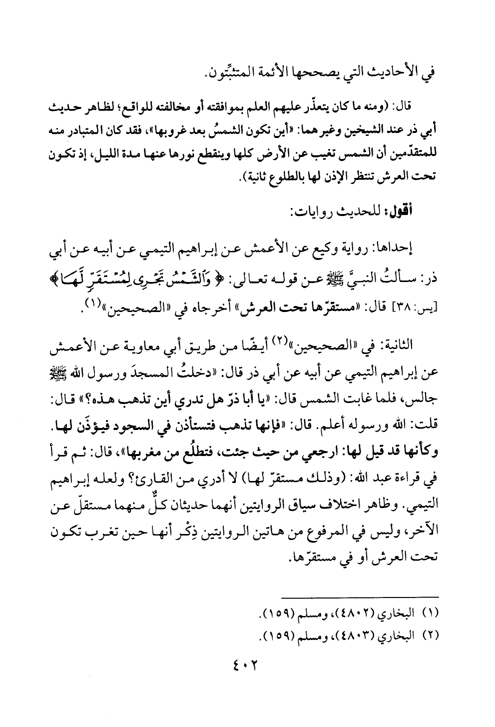 قال: (ومنه ما كان يتعذّر عليهم العلم بموافقته أو مخالفته للواقع؛ لظاهر حديث أبي ذر عند الشيخين وغيرهما: «أين تكون الشمسُ بعد غروبها»، فقد كان المتبادر منه للمتقدّمين أن الشمس تغيب عن الأرض كلها وينقطع نورها عنها مدة الليل، إذ تكون تحت العرش تنتظر الإذن لها بالطلوع ثانية).