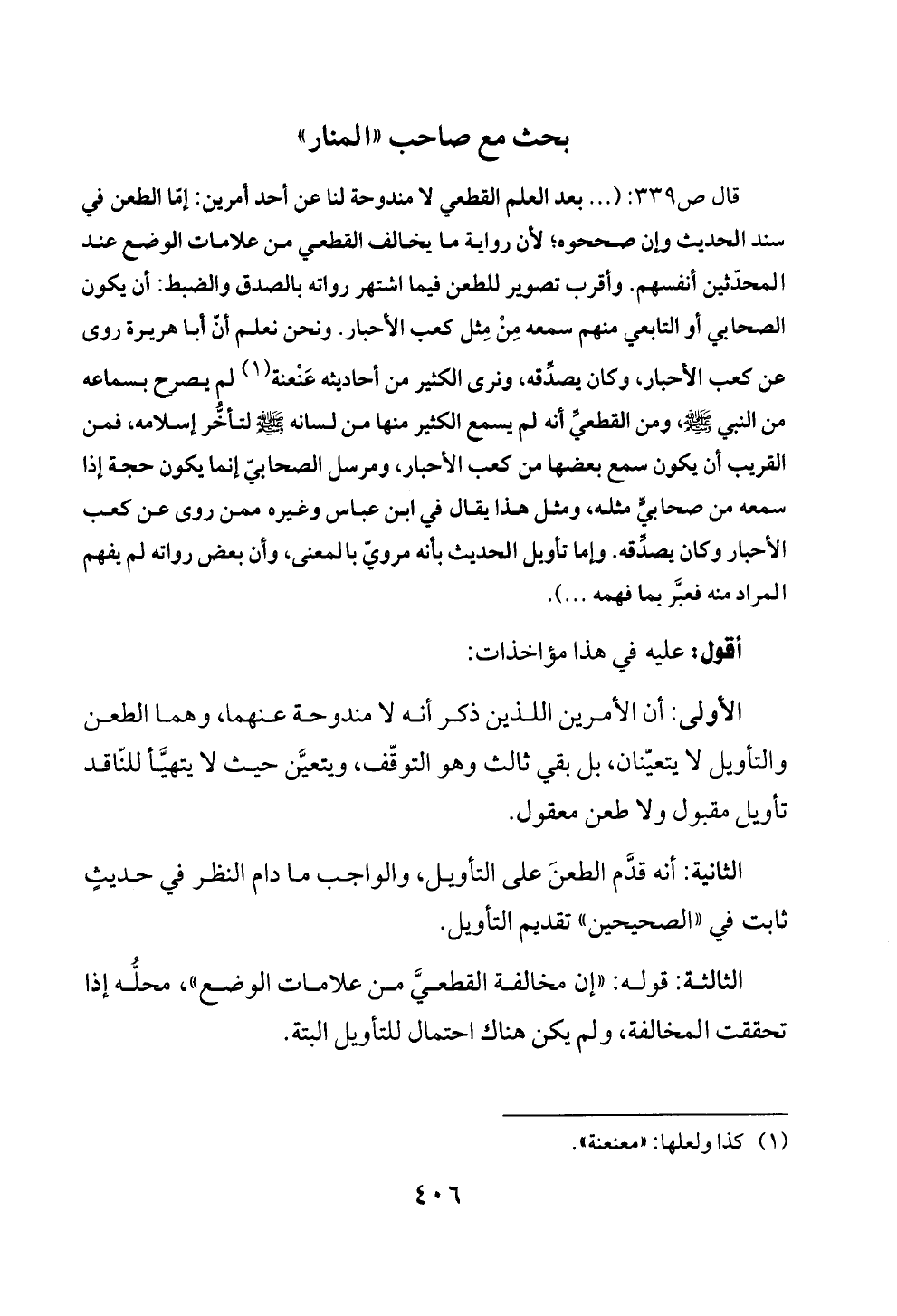 الأولى: أن الأمرين اللذين ذكر أنه لا مندوحة عنهما، وهما الطعن والتأويل لا يتعيّنان، بل بقي ثالث وهو التوقّف، ويتعيَّن حيث لا يتهيَّأ للنّاقد تأويل مقبول ولا طعن معقول.