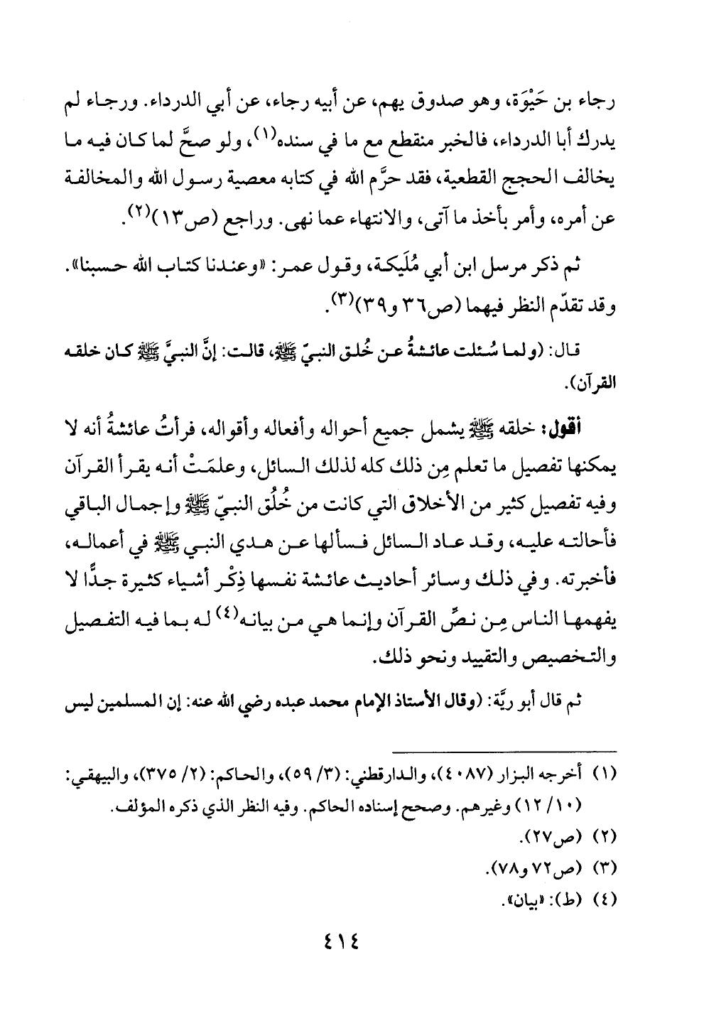 قال: (ولما سُئلت عائشةُ عن خُلق النبيّ - صلى الله عليه وسلم -، قالت: إنَّ النبيَّ - صلى الله عليه وسلم - كان خلقه القرآن).