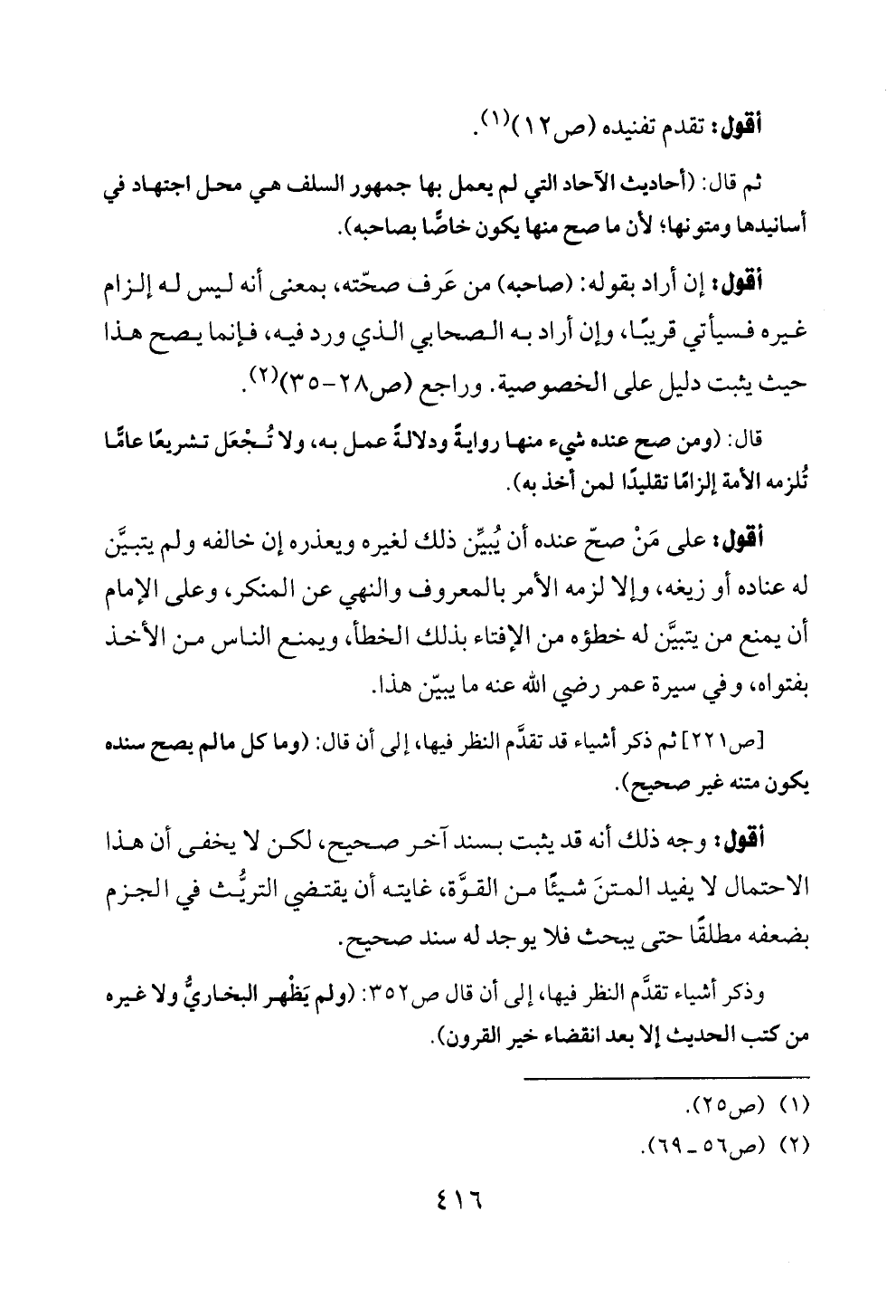 ثم قال: (أحاديث الآحاد التي لم يعمل بها جمهور السلف هي محل اجتهاد في أسانيدها ومتونها؛ لأن ما صح منها يكون خاصًّا بصاحبه).