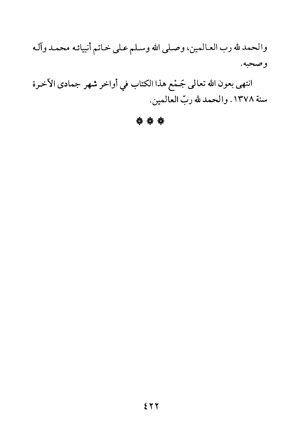 انتهى بعون الله تعالى جَمْع هذا الكتاب في أواخر شهر جمادى الآخرة سنة ١٣٧٨. والحمد لله ربّ العالمين.