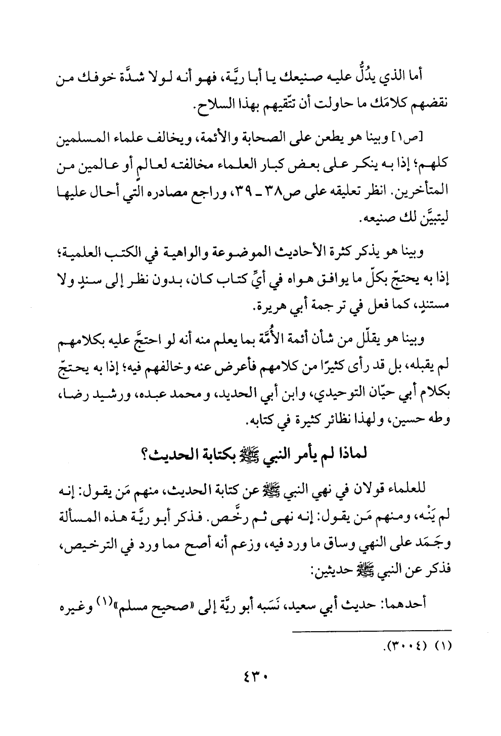 للعلماء قولان في نهي النبي - صلى الله عليه وسلم - عن كتابة الحديث، منهم مَن يقول: إنه لم يَنْه، ومنهم مَن يقول: إنه نهى ثم رخَّص. فذكر أبو ريَّة هذه المسألة وجَمَد على النهي وساق ما ورد فيه، وزعم أنه أصح مما ورد في الترخيص، فذكر عن النبي - صلى الله عليه وسلم - حديثين: