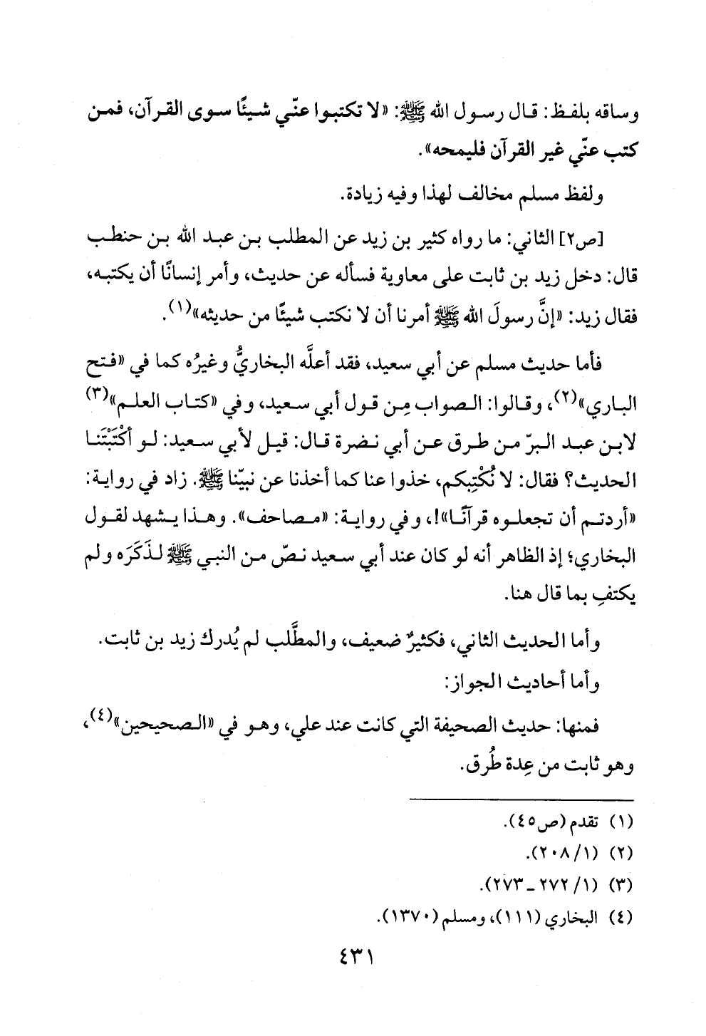فأما حديث مسلم عن أبي سعيد، فقد أعلَّه البخاريُّ وغيرُه كما في "فتح الباري" (¬٢)، وقالوا: الصواب مِن قول أبي سعيد، وفي "كتاب العلم" (¬٣) لابن عبد البرّ من طرق عن أبي نضرة قال: قيل لأبي سعيد: لو أكْتَبْتَنا الحديث؟ فقال: لا نُكْتِبكم، خذوا عنا كما أخذنا عن نبيّنا - صلى الله عليه وسلم -. زاد في رواية: "أردتم أن تجعلوه قرآنًا"! ، وفي رواية: "مصاحف". وهذا يشهد لقول البخاري؛ إذ الظاهر أنه لو كان عند أبي سعيد نصّ من النبي - صلى الله عليه وسلم - لذَكَرَه ولم يكتفِ بما قال هنا.