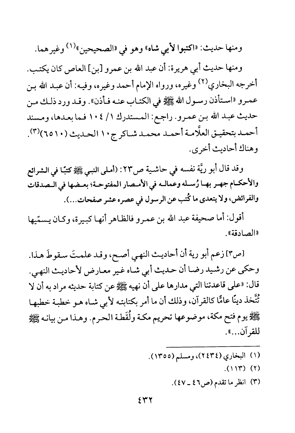 ومنها حديث أبي هريرة: أن عبد الله بن عمرو [بن] العاص كان يكتب. أخرجه البخاري (¬٢) وغيره، ورواه الإمام أحمد وغيره، وفيه: أن عبد الله بن عمرو "استأذن رسول الله - صلى الله عليه وسلم - في الكتاب عنه فأذن". وقد ورد ذلك من حديث عبد الله بن عمرو. راجع: المستدرك ١/ ١٠٤ فما بعدها، ومسند أحمد بتحقيق العلَّامة أحمد محمد شاكر ج ١٠ الحديث (٦٥١٠) (¬٣). وهناك أحاديث أخرى.