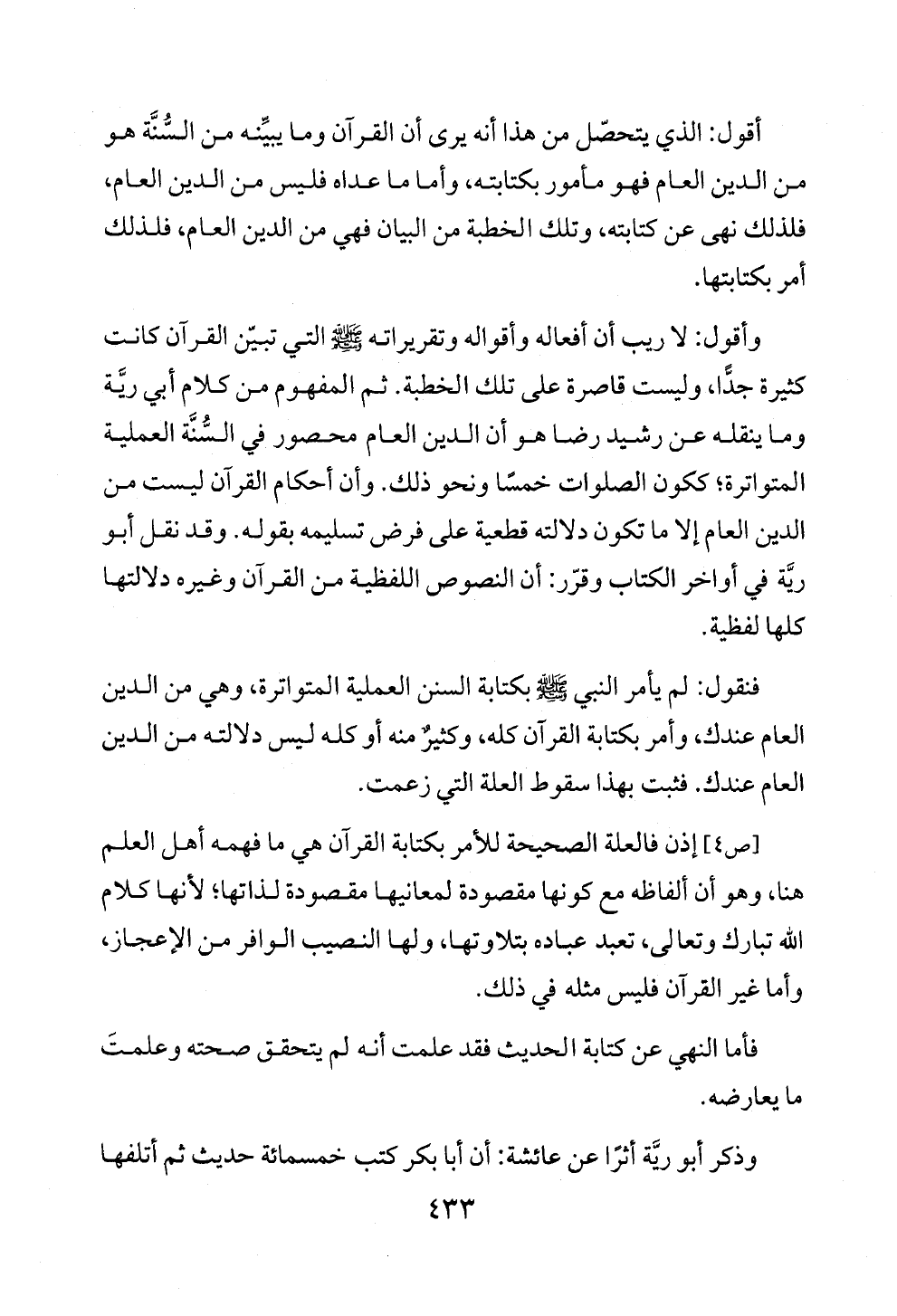[ص ٤] إذن فالعلة الصحيحة للأمر بكتابة القرآن هي ما فهمه أهل العلم هنا، وهو أن ألفاظه مع كونها مقصودة لمعانيها مقصودة لذاتها؛ لأنها كلام الله تبارك وتعالى، تعبد عباده بتلاوتها، ولها النصيب الوافر من الإعجاز، وأما غير القرآن فليس مثله في ذلك.