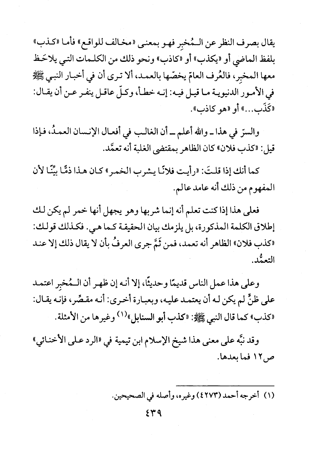 فعلى هذا إذا كنت تعلم أنه إنما شربها وهو يجهل أنها خمر لم يكن لك إطلاق الكلمة المذكورة، بل يلزمك بيان الحقيقة كما هي. فكذلك قولك: "كذب فلان" الظاهر أنه تعمد، فمن ثَمَّ جرى العرفُ بأن لا يقال ذلك إلا عند التعمُّد.