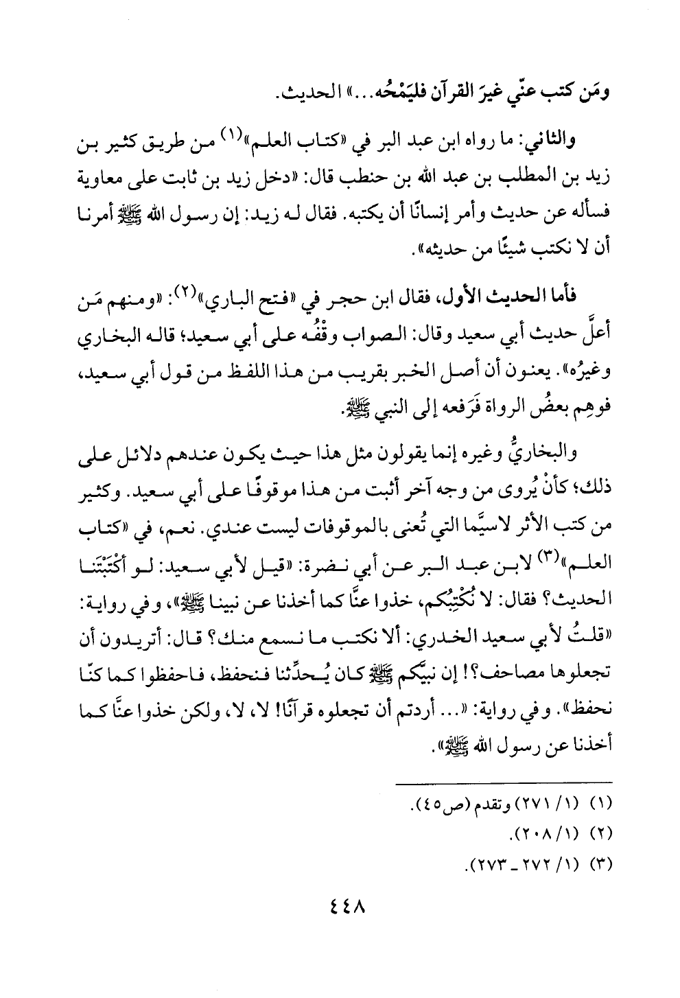 والثاني: ما رواه ابن عبد البر في "كتاب العلم" (¬١) من طريق كثير بن زيد بن المطلب بن عبد الله بن حنطب قال: "دخل زيد بن ثابت على معاوية فسأله عن حديث وأمر إنسانًا أن يكتبه. فقال له زيد: إن رسول الله - صلى الله عليه وسلم - أمرنا أن لا نكتب شيئًا من حديثه".