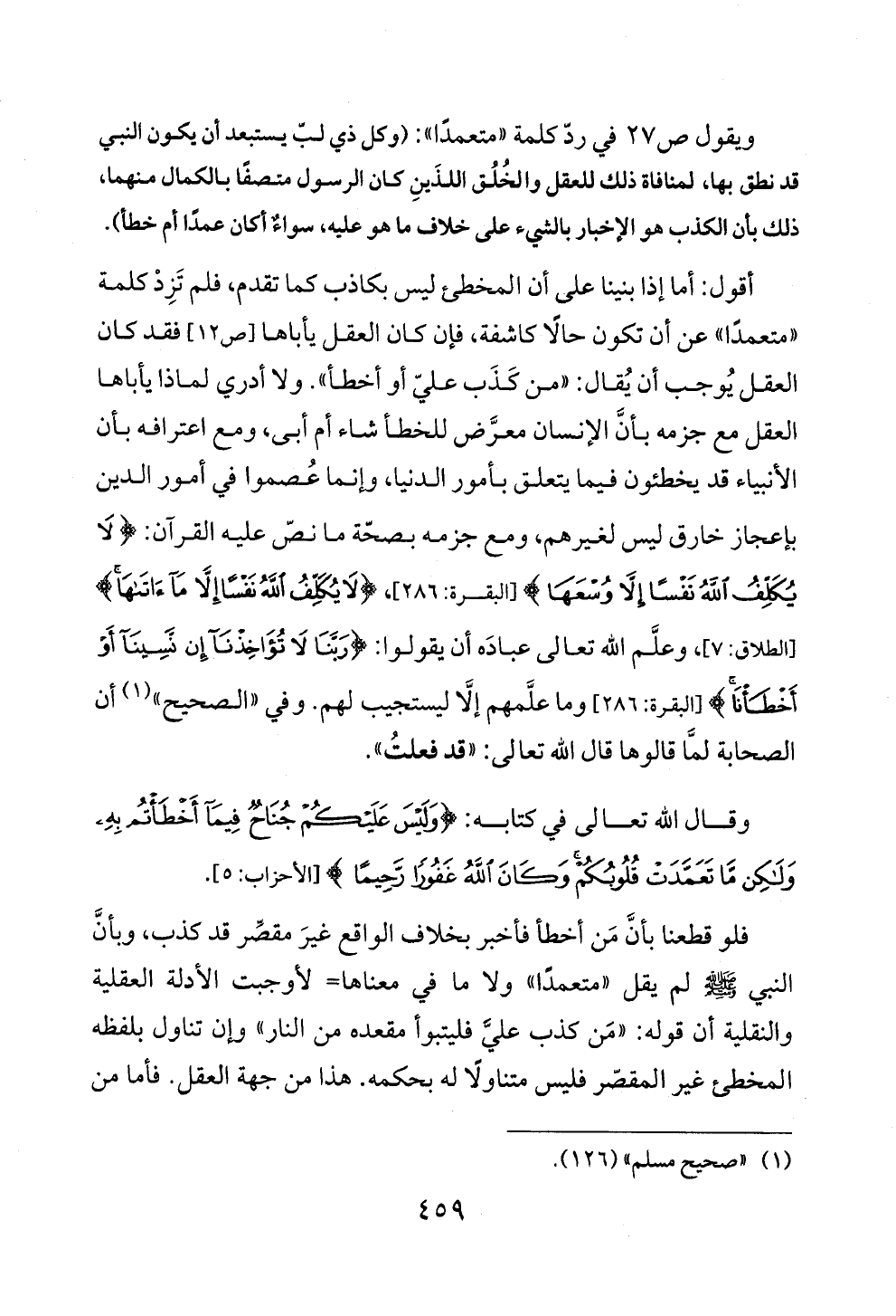ويقول ص ٢٧ في ردّ كلمة "متعمدًا": (وكل ذي لبّ يستبعد أن يكون النبي قد نطق بها، لمنافاة ذلك للعقل والخُلُق اللذَينِ كان الرسول متصفًا بالكمال منهما، ذلك بأن الكذب هو الإخبار بالشيء على خلاف ما هو عليه، سواءٌ أكان عمدًا أم خطأ).