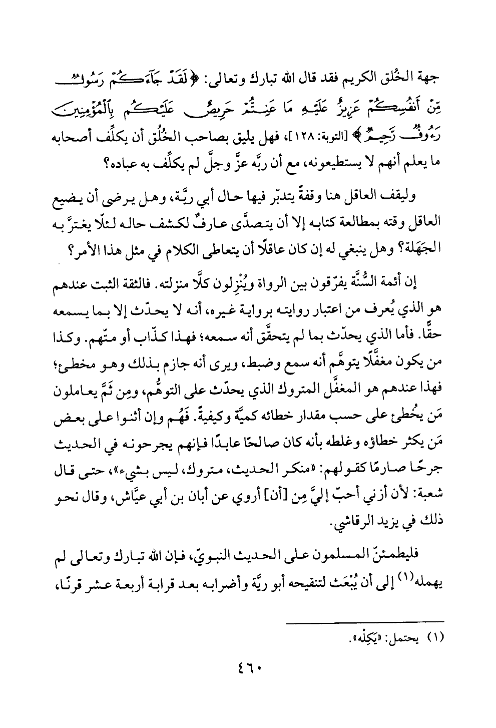 وليقف العاقل هنا وقفةً يتدبّر فيها حال أبي ريَّة، وهل يرضى أن يضيع العاقل وقته بمطالعة كتابه إلا أن يتصدَّى عارفٌ لكشف حاله لئلّا يغترَّ به الجَهَلة؟ وهل ينبغي له إن كان عاقلًا أن يتعاطى الكلام في مثل هذا الأمر؟