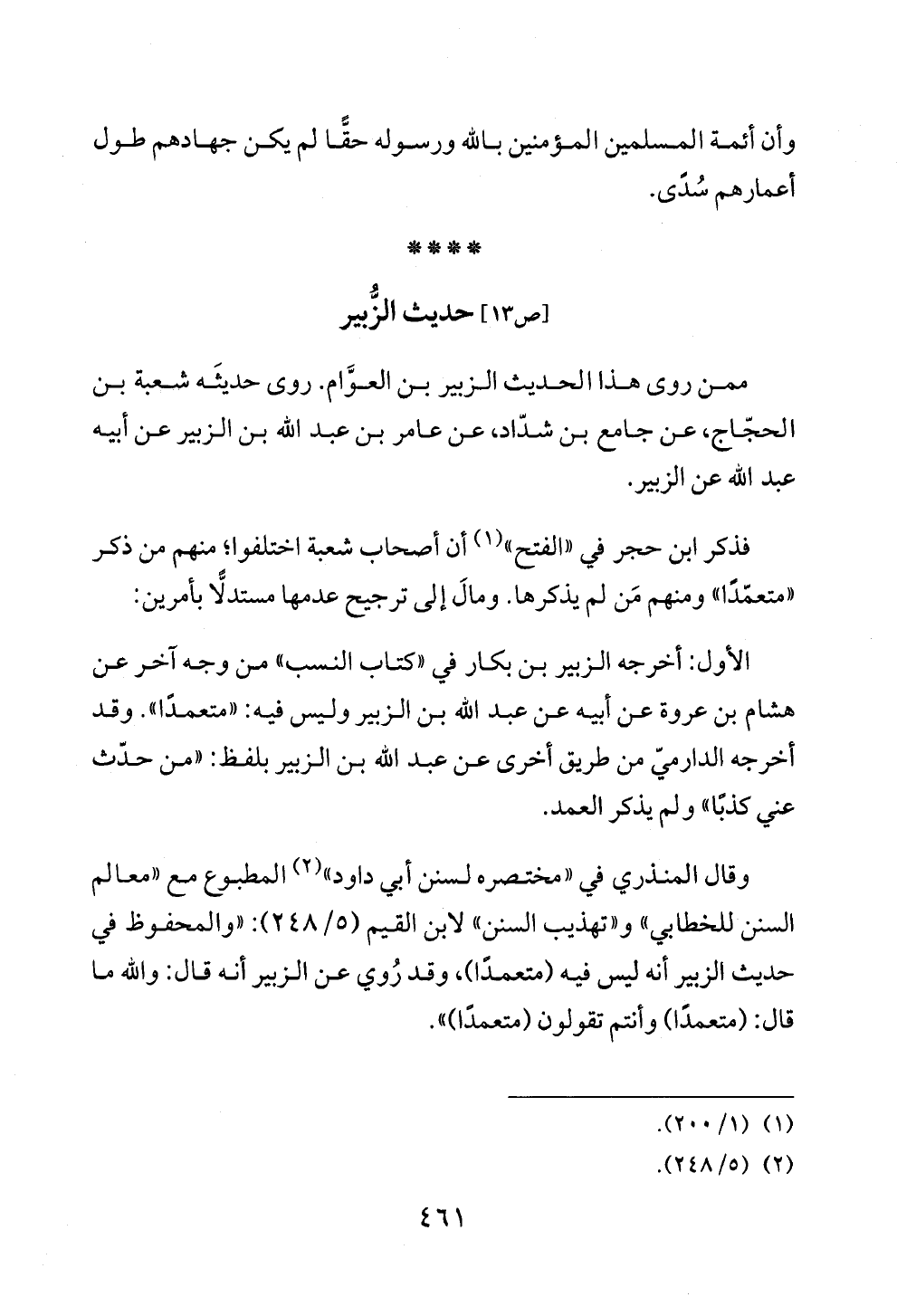 وقال المنذري في "مختصره لسنن أبي داود" (¬٢) المطبوع مع "معالم السنن للخطابي" و"تهذيب السنن" لابن القيم (٥/ ٢٤٨): "والمحفوظ في حديث الزبير أنه ليس فيه (متعمدًا)، وقد رُوي عن الزبير أنه قال: والله ما قال: (متعمدًا) وأنتم تقولون (متعمدًا) ".