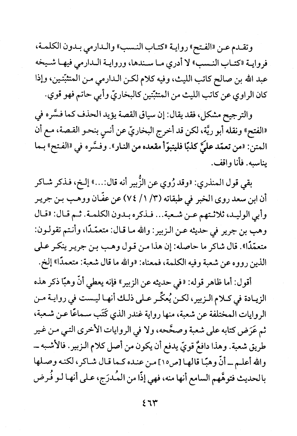 أقول: أما ظاهر قوله: "في حديثه عن الزبير" فإنه يعطي أنّ وهبًا ذكر هذه الزيادة في كلام الزبير، لكن يُعكِّر على ذلك أنها ليست في رواية من الروايات المختلفة عن شعبة، منها رواية غندر الذي كَتَب سماعًا عن شعبة، ثم عَرَض كتابه على شعبة وصحَّحه، ولا في الروايات الأخرى التي من غير طريق شعبة. وهذا دافعٌ قويّ يدفع أن يكون من أصل كلام الزبير. فالأشبه ــ والله أعلم ــ أنّ وهبًا قالها [ص ١٥] من عنده كما قال شاكر، لكنه وصلها بالحديث فتوهَّهم السامع أنها منه، فهي إذًا من المُدرَج، على أنها لو فُرض