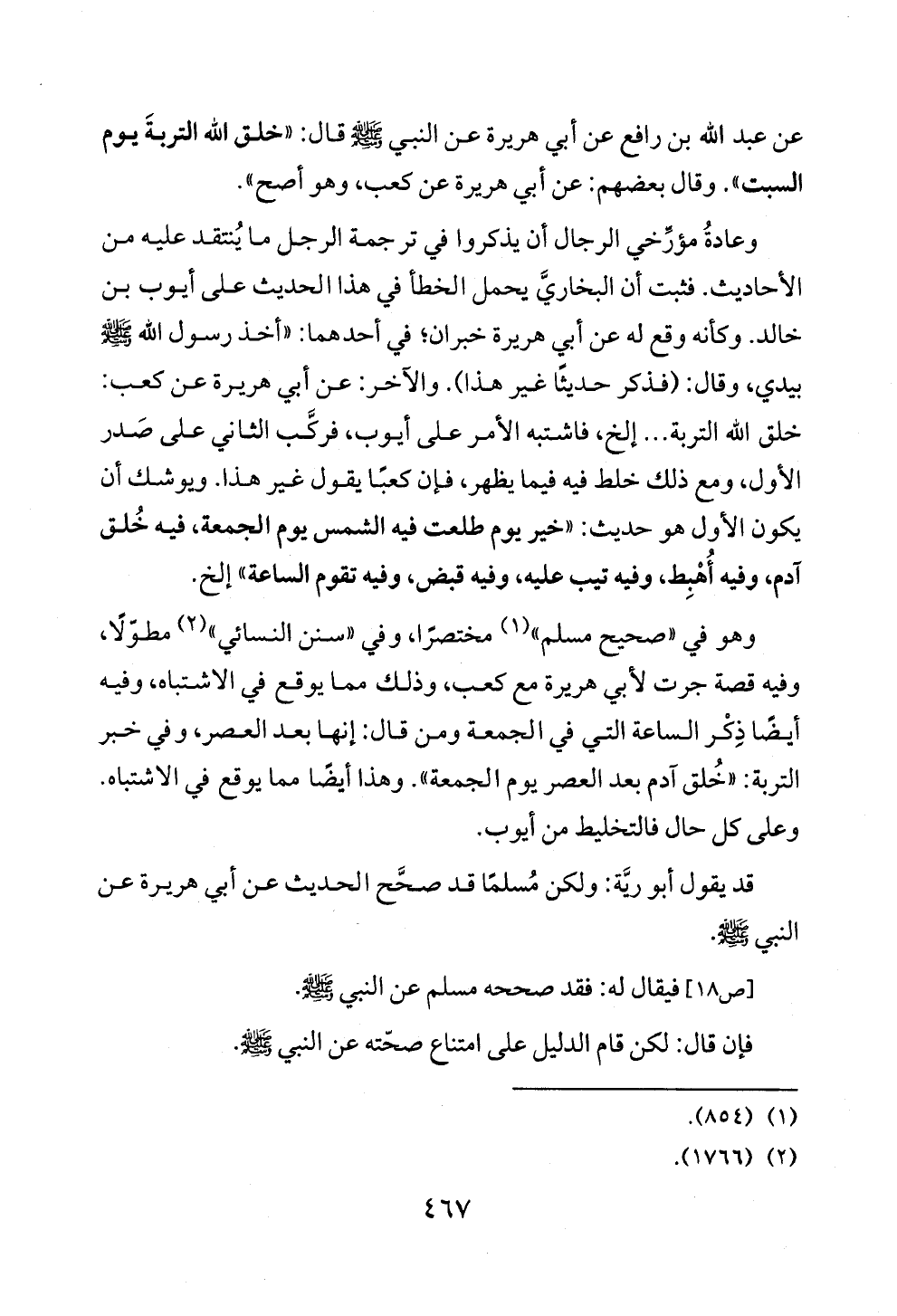 وعادةُ مؤرِّخي الرجال أن يذكروا في ترجمة الرجل ما يُنتقد عليه من الأحاديث. فثبت أن البخاريَّ يحمل الخطأ في هذا الحديث على أيوب بن خالد. وكأنه وقع له عن أبي هريرة خبران؛ في أحدهما: "أخذ رسول الله - صلى الله عليه وسلم - بيدي، وقال: (فذكر حديثًا غير هذا). والآخر: عن أبي هريرة عن كعب: خلق الله التربة ... إلخ، فاشتبه الأمر على أيوب، فركَّب الثاني على صَدر الأول، ومع ذلك خلط فيه فيما يظهر، فإن كعبًا يقول غير هذا. ويوشك أن يكون الأول هو حديث: "خير يوم طلعت فيه الشمس يوم الجمعة، فيه خُلق آدم، وفيه أُهْبِط، وفيه تيب عليه، وفيه قبض، وفيه تقوم الساعة" إلخ.