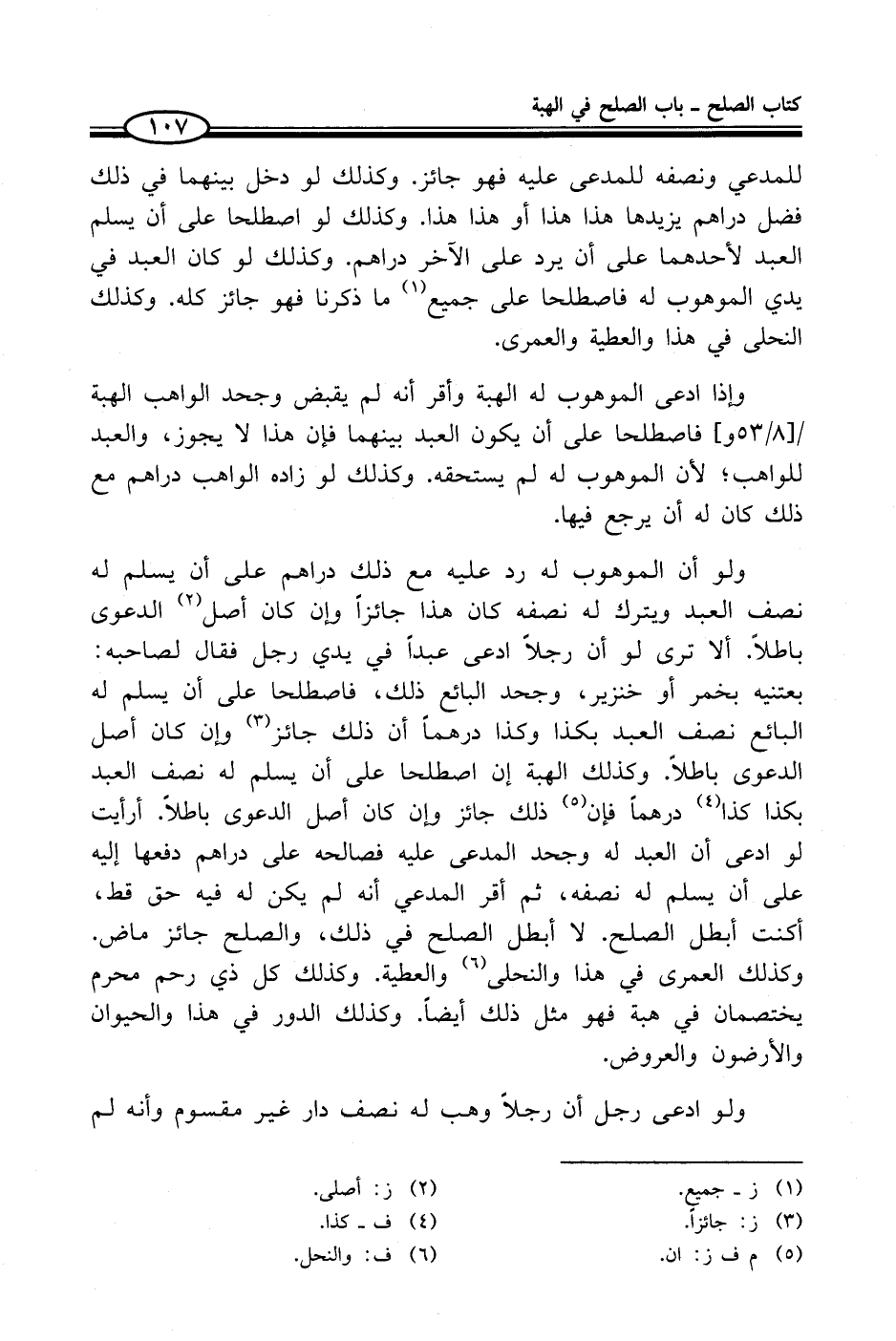 ولو أن الموهوب له رد عليه مع ذلك دراهم على أن يسلم له نصف العبد ويترك له نصفه كان هذا جائزاً وإن كان أصل (¬2) الدعوى باطلاً. ألا ترى لو أن رجلاً ادعى عبداً في يدي رجل فقال لصاحبه: بعتنيه بخمر أو خنزير، وجحد البائع ذلك، فاصطلحا على أن يسلم له البائع نصف العبد بكذا وكذا درهماً أن ذلك جائز (¬3) وإن كان أصل الدعوى باطلاً. وكذلك الهبة إن اصطلحا على أن يسلم له نصف العبد بكذا كذا (¬4) درهماً فإن (¬5) ذلك جائز وإن كان أصل الدعوى باطلاً. أرأيت لو ادعى أن العبد له وجحد المدعى عليه فصالحه على دراهم دفعها إليه على أن يسلم له نصفه، ثم أقر المدعي أنه لم يكن له فيه حق قط، أكنت أبطل الصلح. لا أبطل الصلح في ذلك، والصلح جائز ماض. وكذلك العمرى في هذا والنحلى (¬6) والعطية. وكذلك كل ذي رحم محرم يختصمان في هبة فهو مثل ذلك أيضاً. وكذلك الدور في هذا والحيوان والأرضون والعروض.