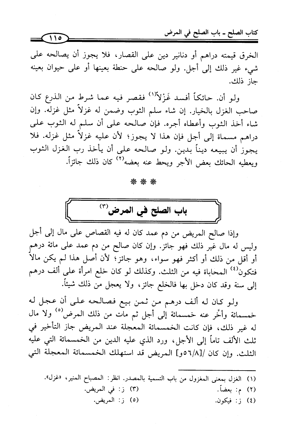 وإذا صالح المريض من دم عمد كان له فيه القصاص على مال إلى أجل وليس له مال غير ذلك فهو جائز. وإن كان صالح من دم عمد على مائة درهم أو أقل من ذلك أو أكثر فهو سواء، وهو جائز، لأن أصل هذا لم يكن مالا فتكون (¬4) المحاباة فيه من الثلث. وكذلك لو كان خلع امرأة على ألف درهم إلى سنة وقد كان دخل بها فالخلع جائز، ولا يعجل من ذلك شيئاً.