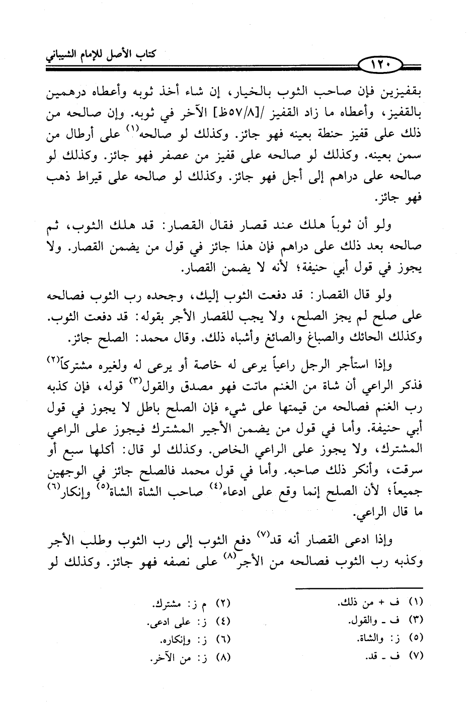 ولو أن ثوباً هلك عند قصار فقال القصار: قد هلك الثوب، ثم صالحه بعد ذلك على دراهم فإن هذا جائز في قول من يضمن القصار. ولا يجوز في قول أبي حنيفة؛ لأنه لا يضمن القصار.