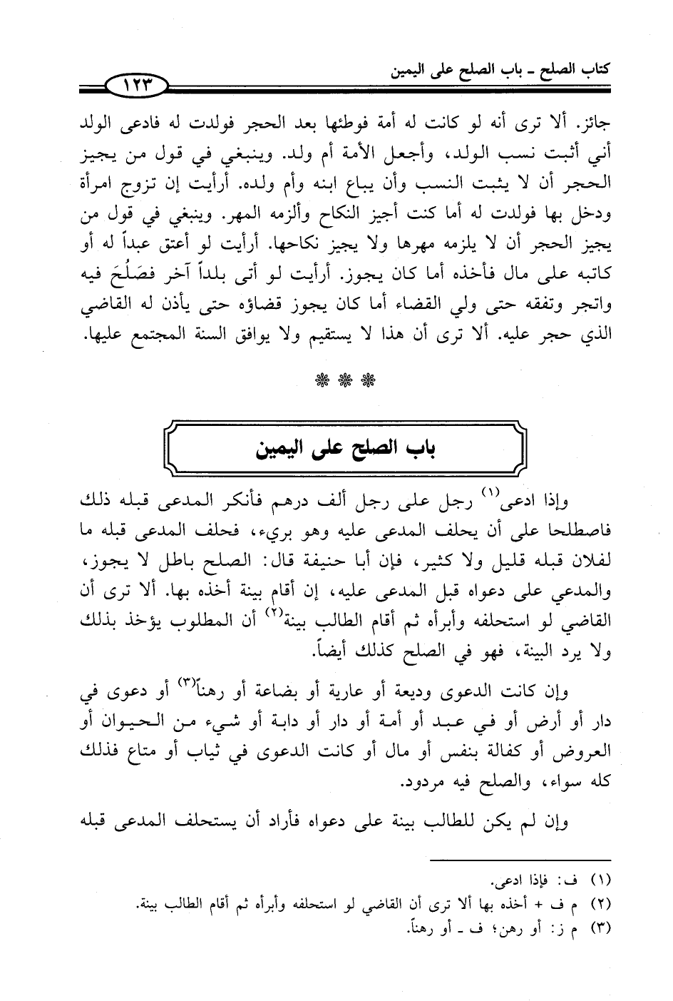 وإذا ادعى (¬1) رجل على رجل ألف درهم فأنكر المدعى قبله ذلك فاصطلحا على أن يحلف المدعى عليه وهو بريء، فحلف المدعى قبله ما لفلان قبله قليل ولا كثير، فإن أبا حنيفة قال: الصلح باطل لا يجوز، والمدعي على دعواه قبل المدعى عليه، إن أقام بينة أخذه بها. ألا ترى أن القاضي لو استحلفه وأبرأه ثم أقام الطالب بينة (¬2) أن المطلوب يؤخذ بذلك ولا يرد البينة، فهو في الصلح كذلك أيضاً.